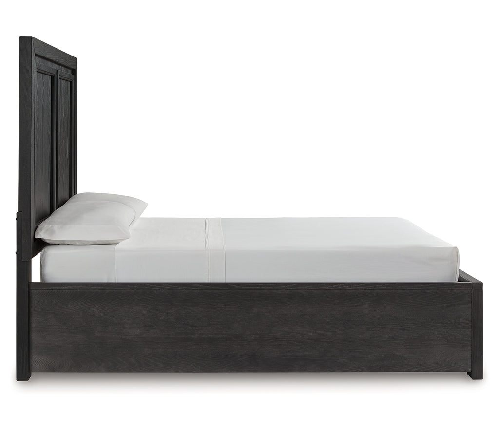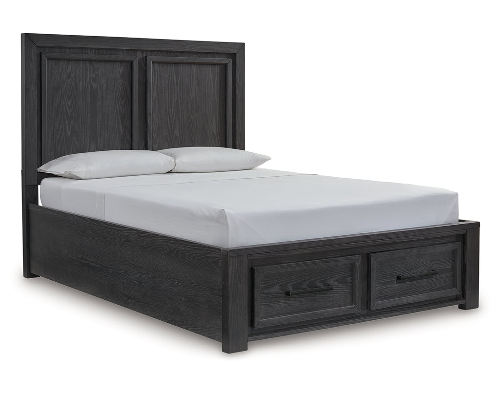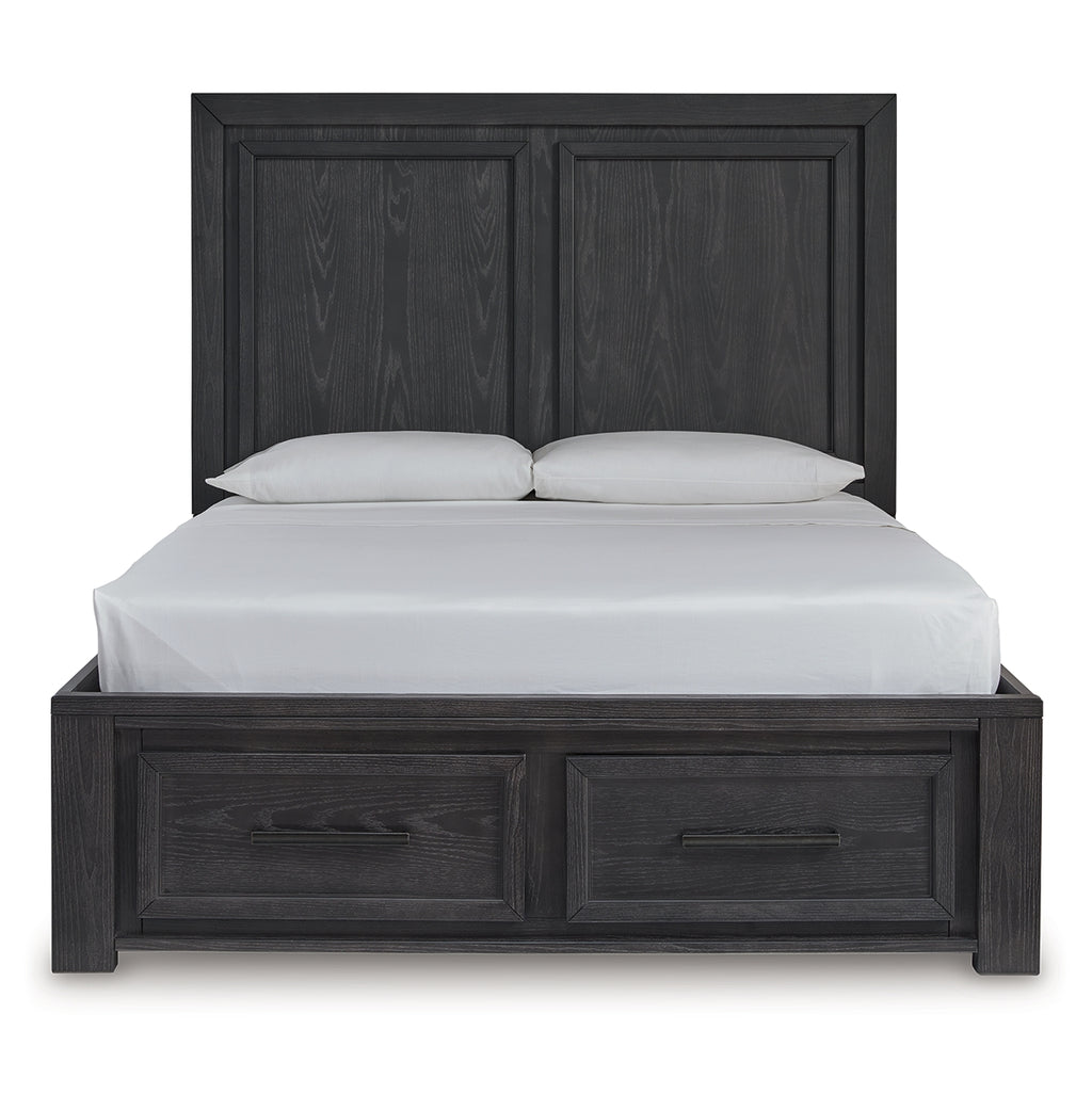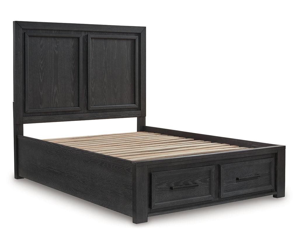 Includes queen panel headboard, storage footboard, and rails with roll slats