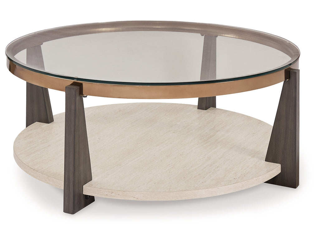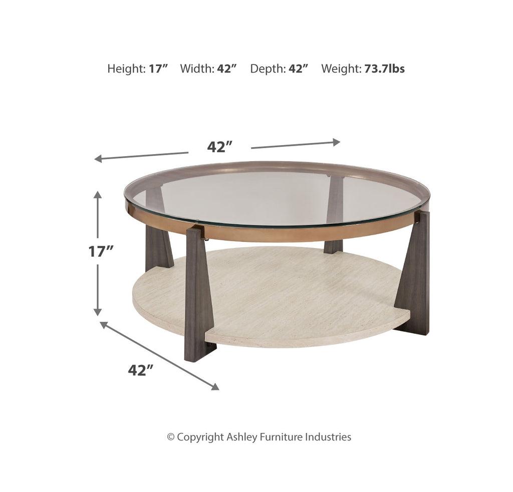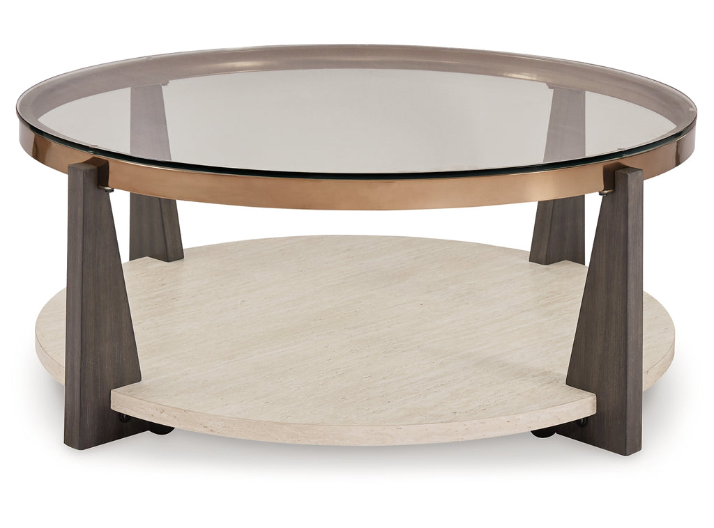 A modern twist on mixed-media design, the Frazwa coffee table is totally brilliant. Solid wood legs and a faux travertine shelf merge splendidly with the metal frame for a fresh, contemporary aesthetic. Casters allow you to roll it wherever you please. Talk about the perfect spot for cocktails and morning coffee to land. | Product Features