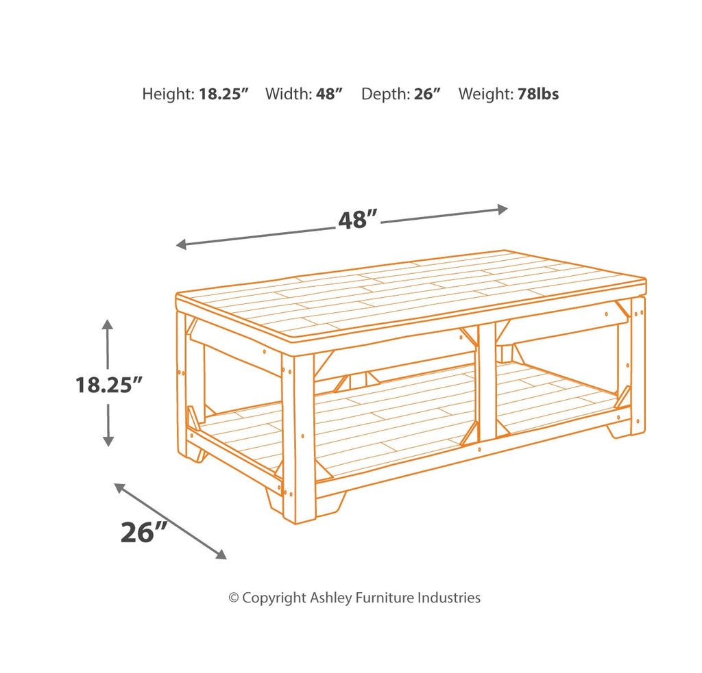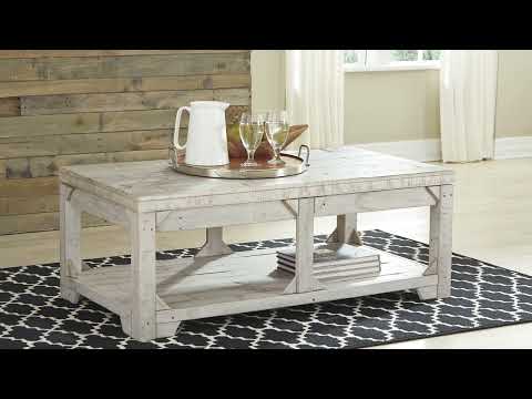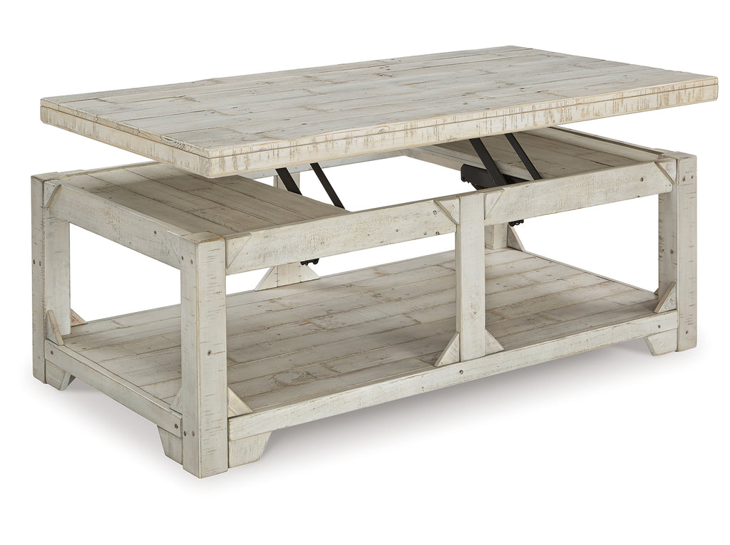 Take in the country fresh look of this lift top coffee table and reminisce of a simpler time. Its farmhouse style is evident in its stocky design with planked top/bottom shelf, unique triangle accents and relaxed white washed finish. With a handcrafted look thanks to reclaimed wood, you'll love the casual feel this piece brings to your living area. Plus, easy lift top feature accommodates eating or working in front of the television.