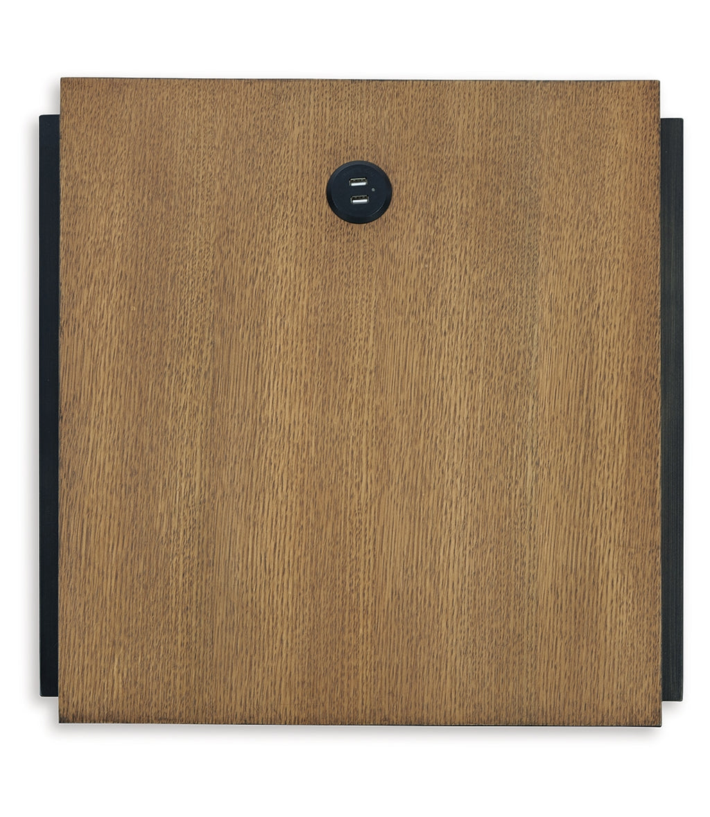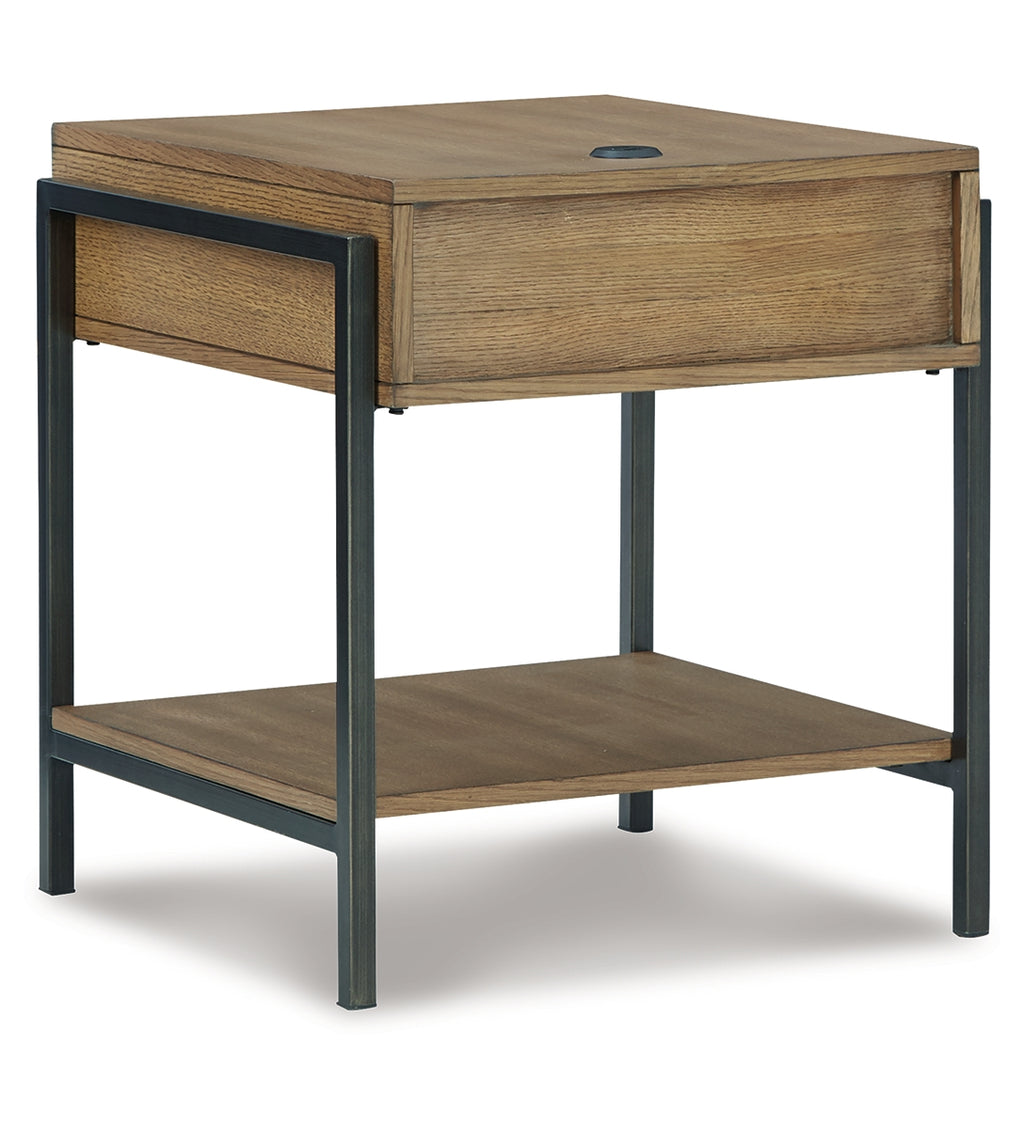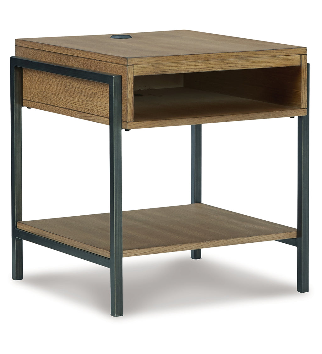 Beautiful to behold, this urban contemporary end table is loaded with high style and convenience. The wood sports a light, natural-looking finish that provides a dramatic contrast to the black metal frame. Its open cubby is perfect for stowing away books and magazines. A cleverly placed AC/USB charging port on the top lets you power up without moving a muscle. | Product Features