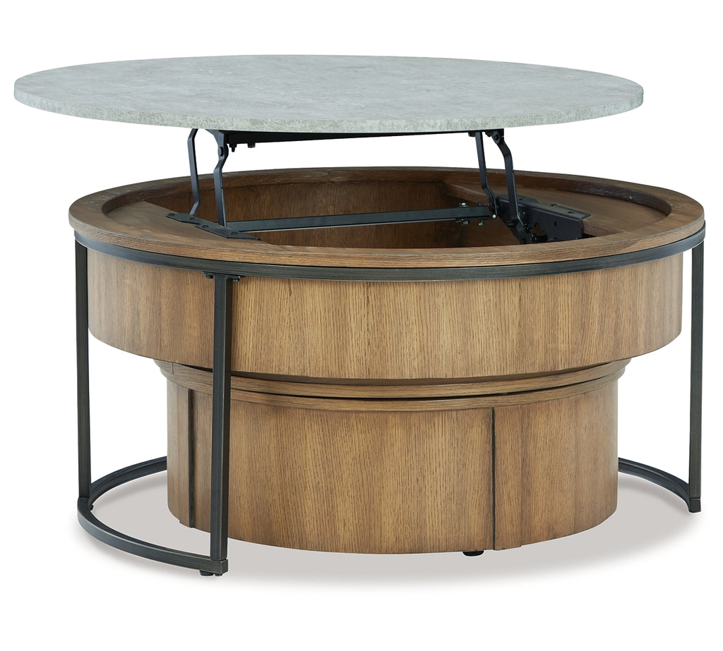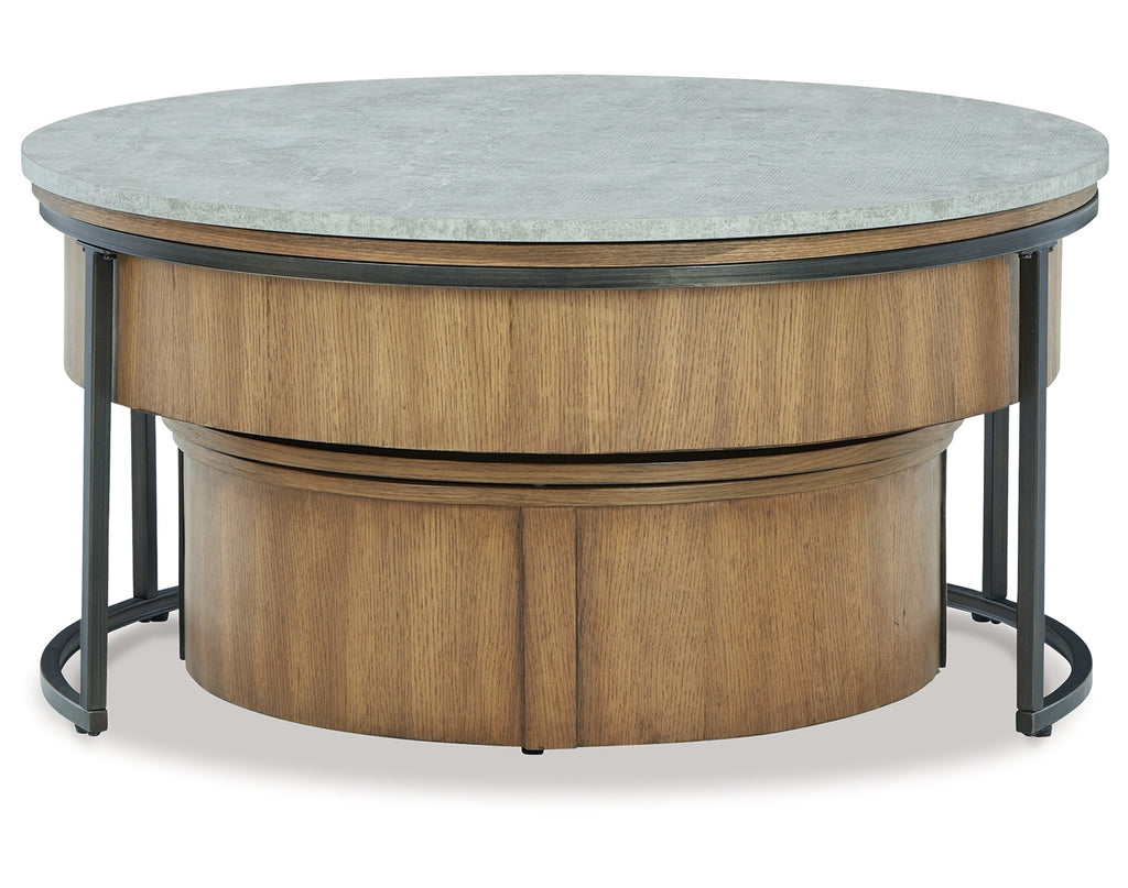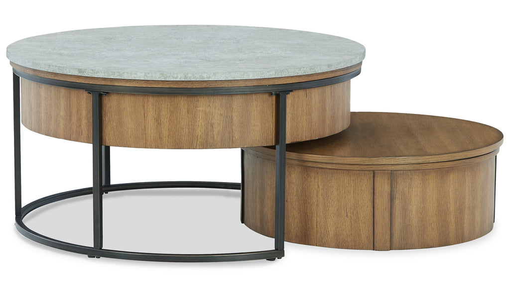 Beautiful to behold, this nesting coffee table set is loaded with style. Featuring an urban contemporary profile, the coffee table features a suspended drum design and a durable faux cement melamine lift top with hidden storage. Equipped with casters for easy access, the rolling trunk does double duty as serving space and storage. Perfect for mixed-use living arrangements. | Product Features