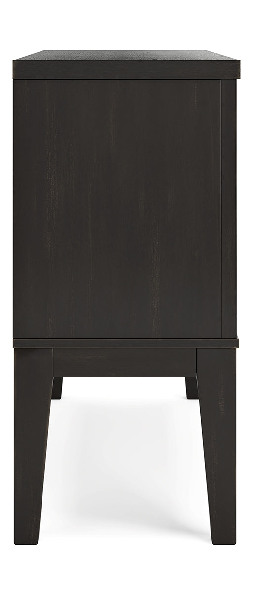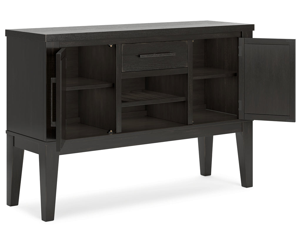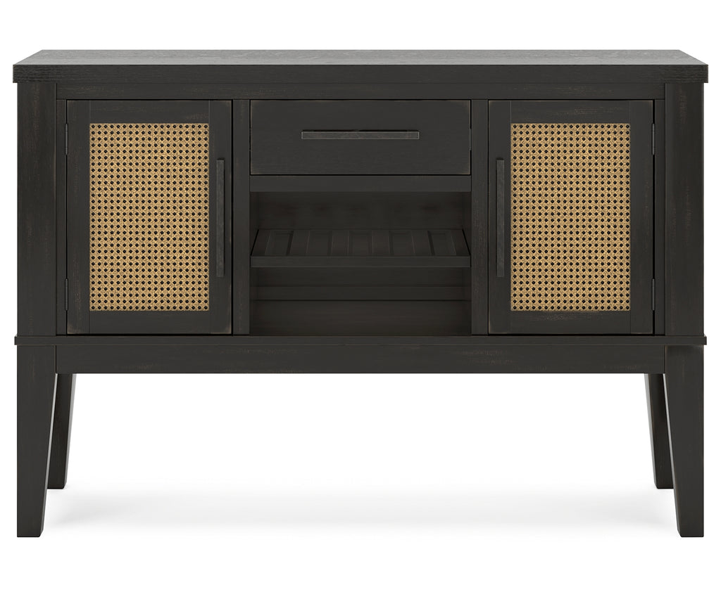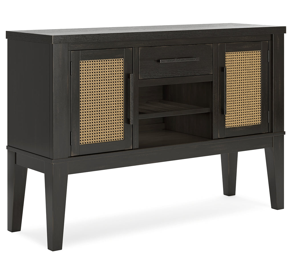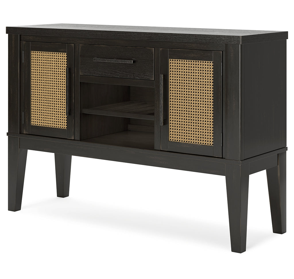 This dining server brings a rustic vibe to urban contemporary design. It’s a modern approach to natural beauty, with faux cane accents incorporating eye-catching texture. Chic storage is made possible with a reversible wine rack shelf, a drawer and cabinets. And the server’s color palette is stunningly simple, allowing it to coordinate seamlessly with your existing decor. | Product Features