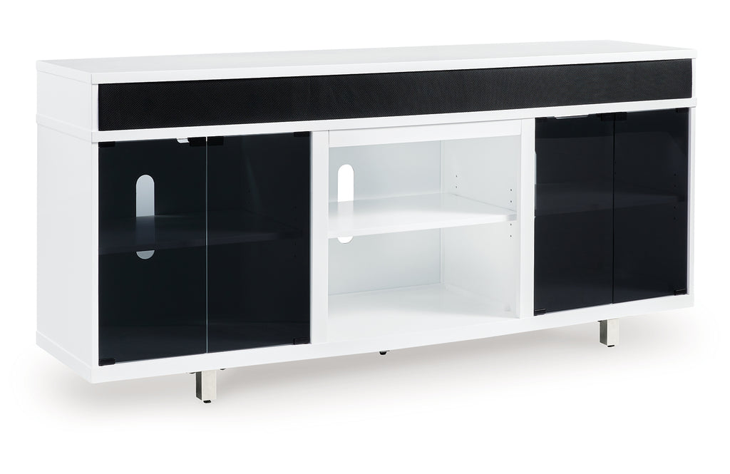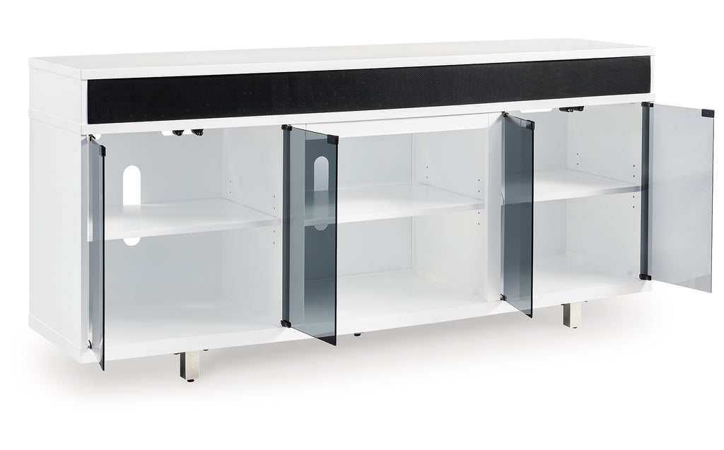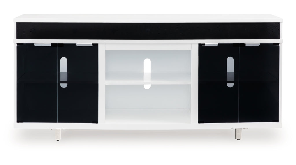 Combining a white high-gloss finish with black glass doors, this TV stand proves opposites really do attract. It's the perfect blend of modern style and functionality, with an electric fireplace option and ample space for your media devices, flat-screen TV and soundbar. What a smart choice on so many levels. | Product Features