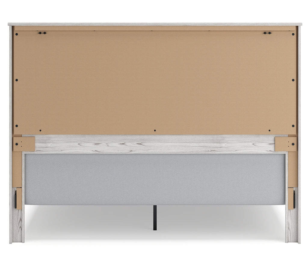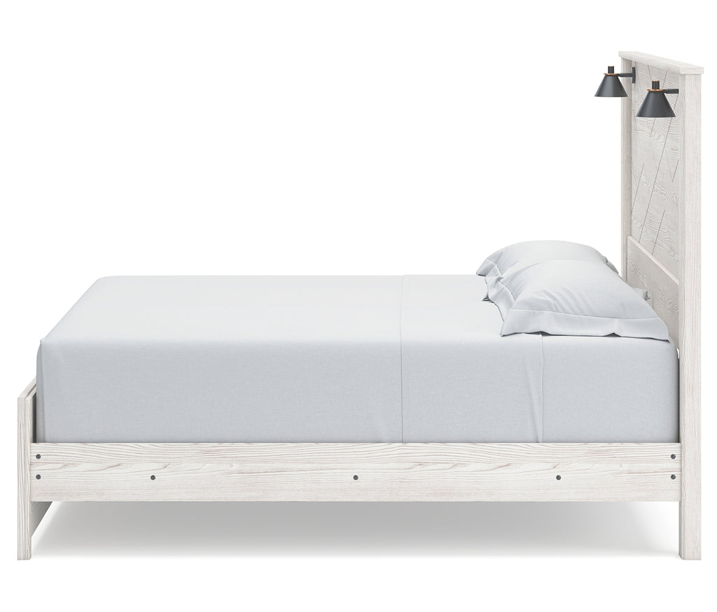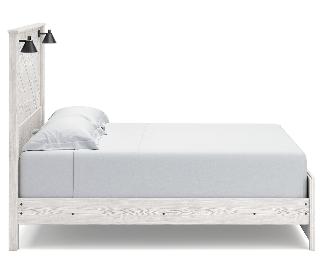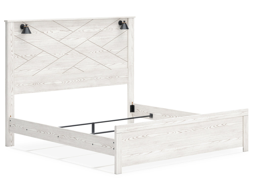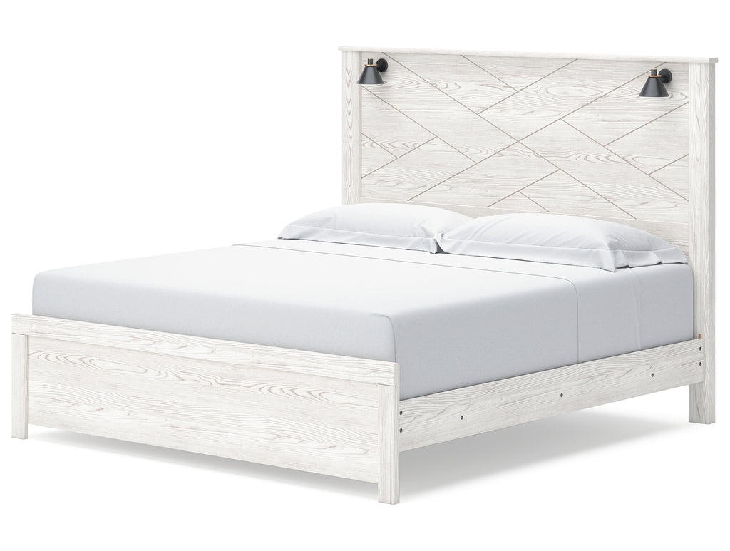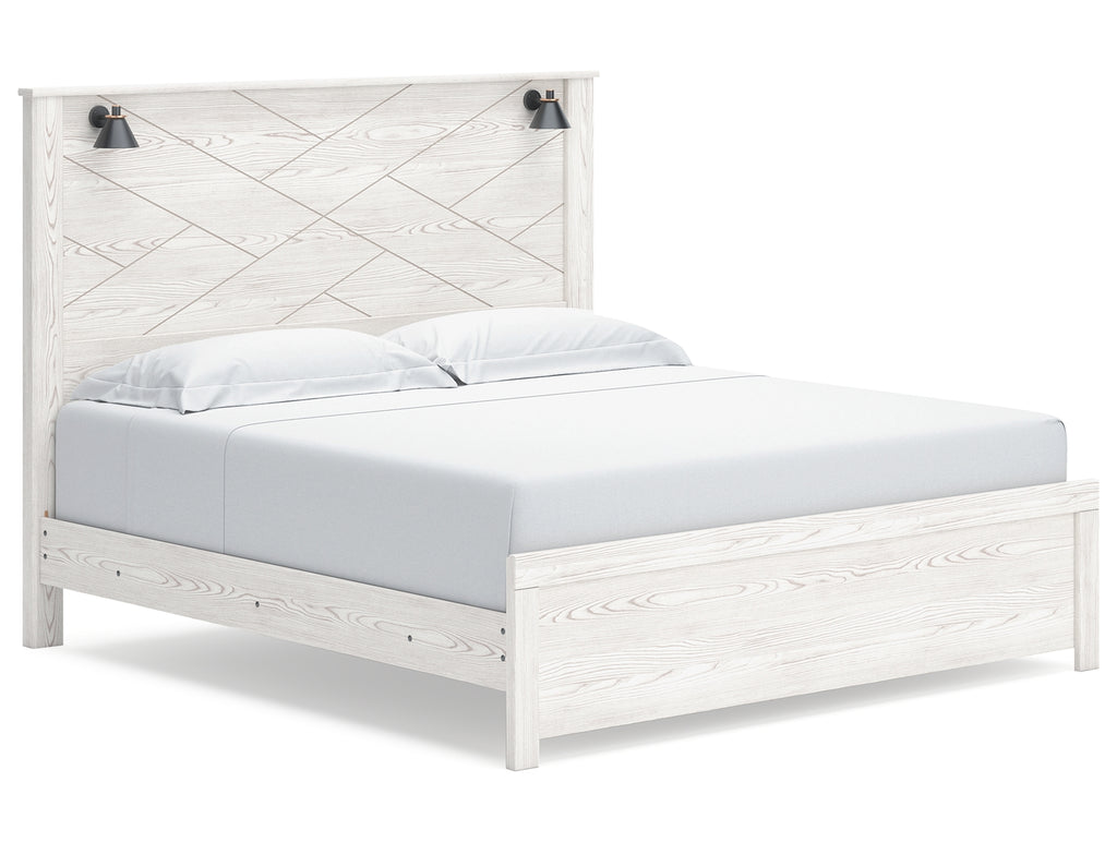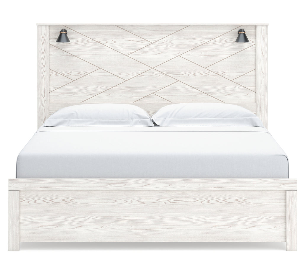 Cool, clean and casually modern. This king panel bed’s white rustic finish sets the tone for your calming sanctuary. Matte black sconce lights and an abstract design on the headboard bring a fresh look to the bed’s simply stunning profile.