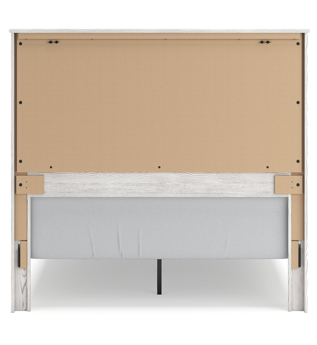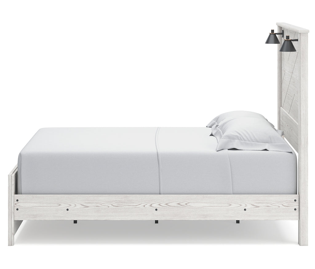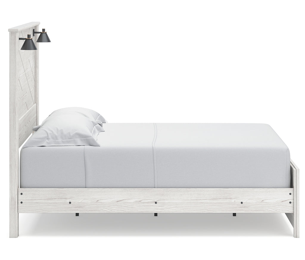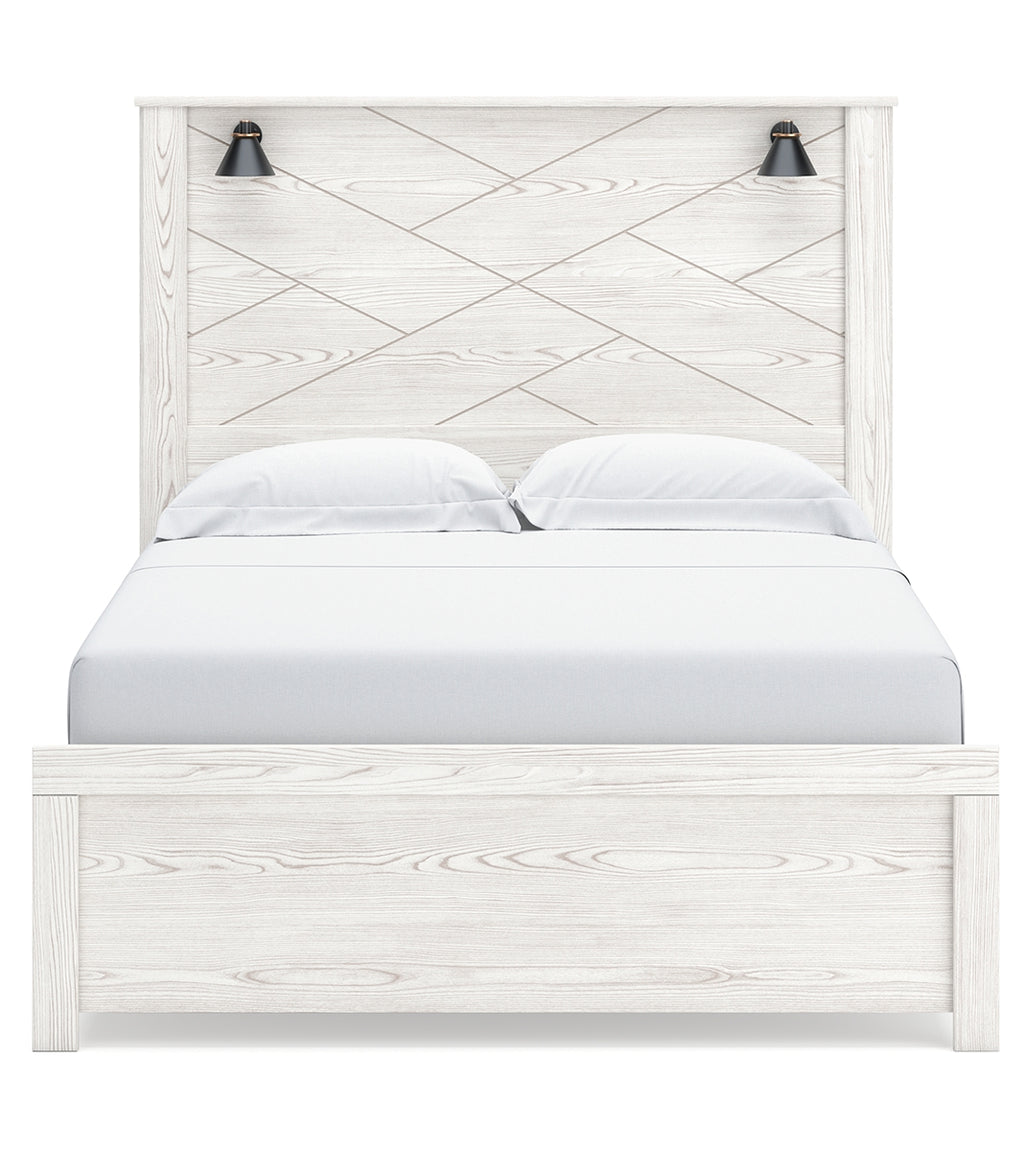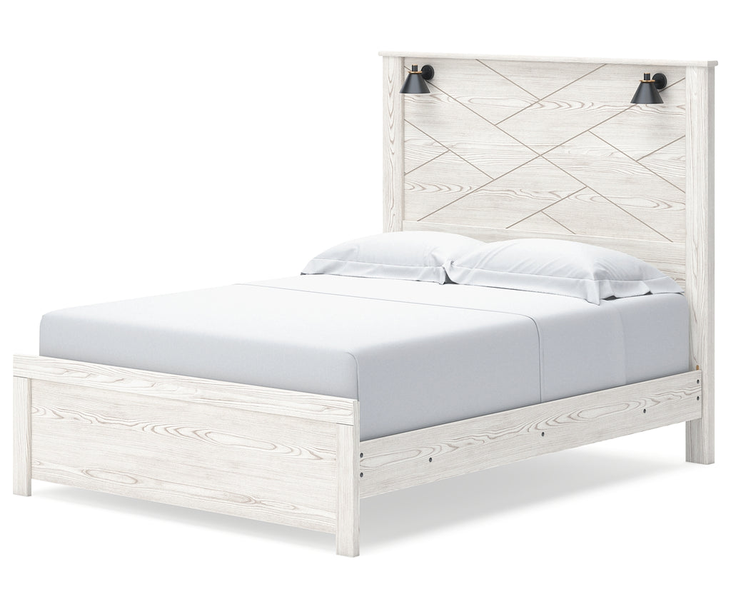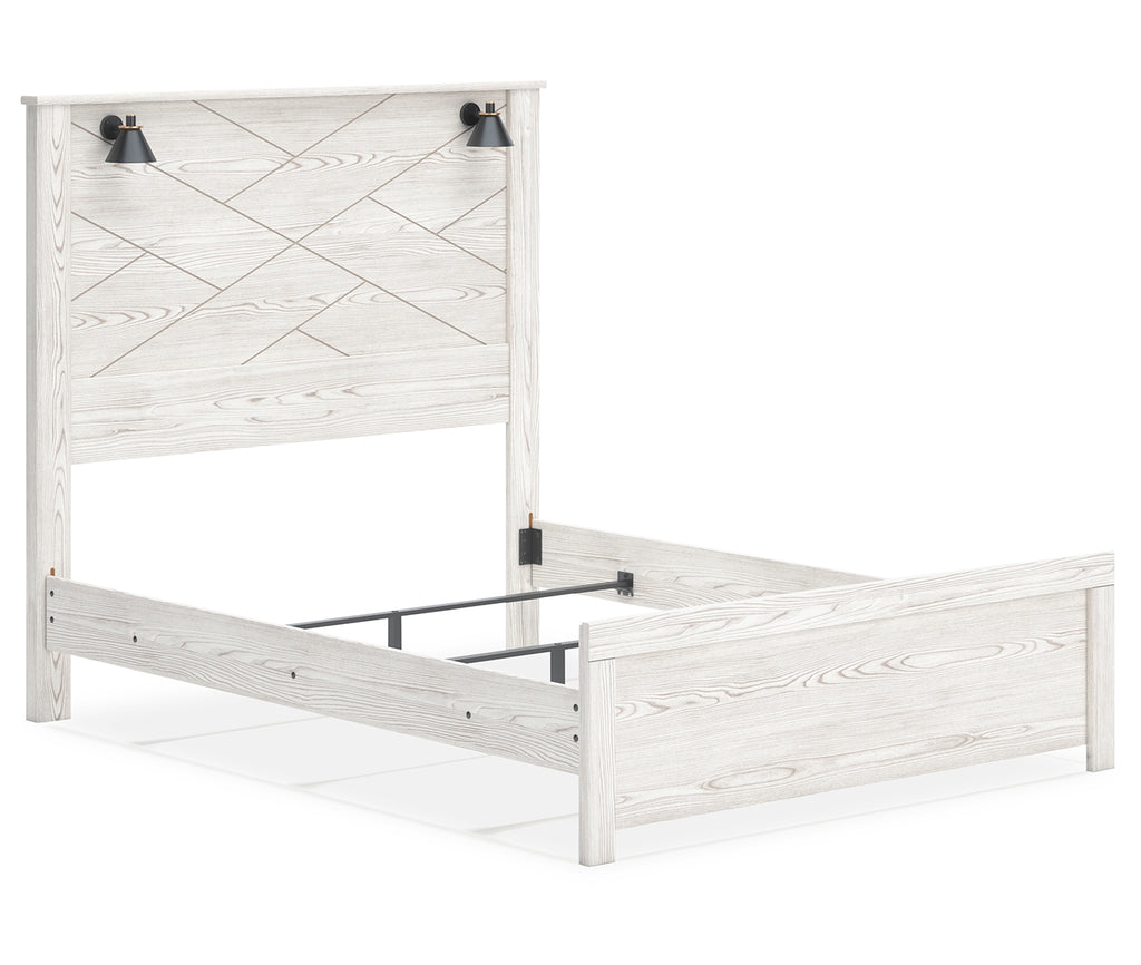Cool, clean and casually modern. This queen panel bed’s white rustic finish sets the tone for your calming sanctuary. Matte black sconce lights and an abstract design on the headboard bring a fresh look to the bed’s simply stunning profile. | Product Features