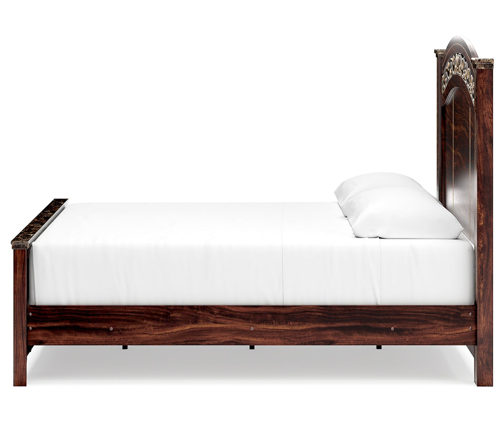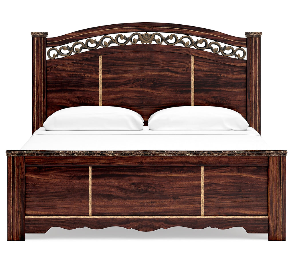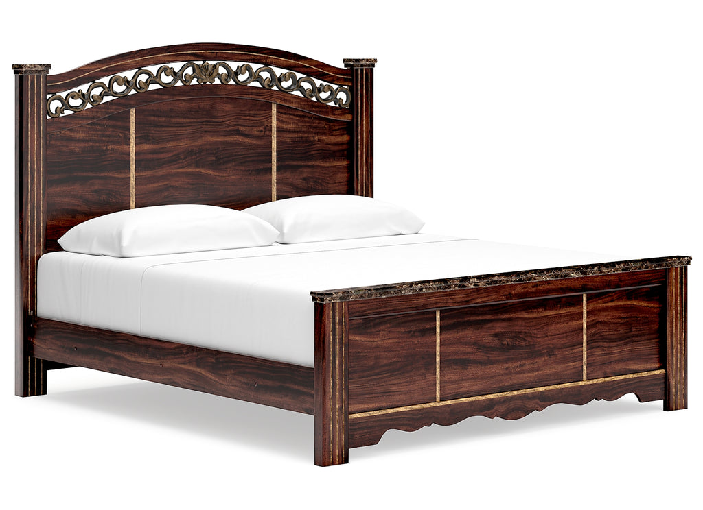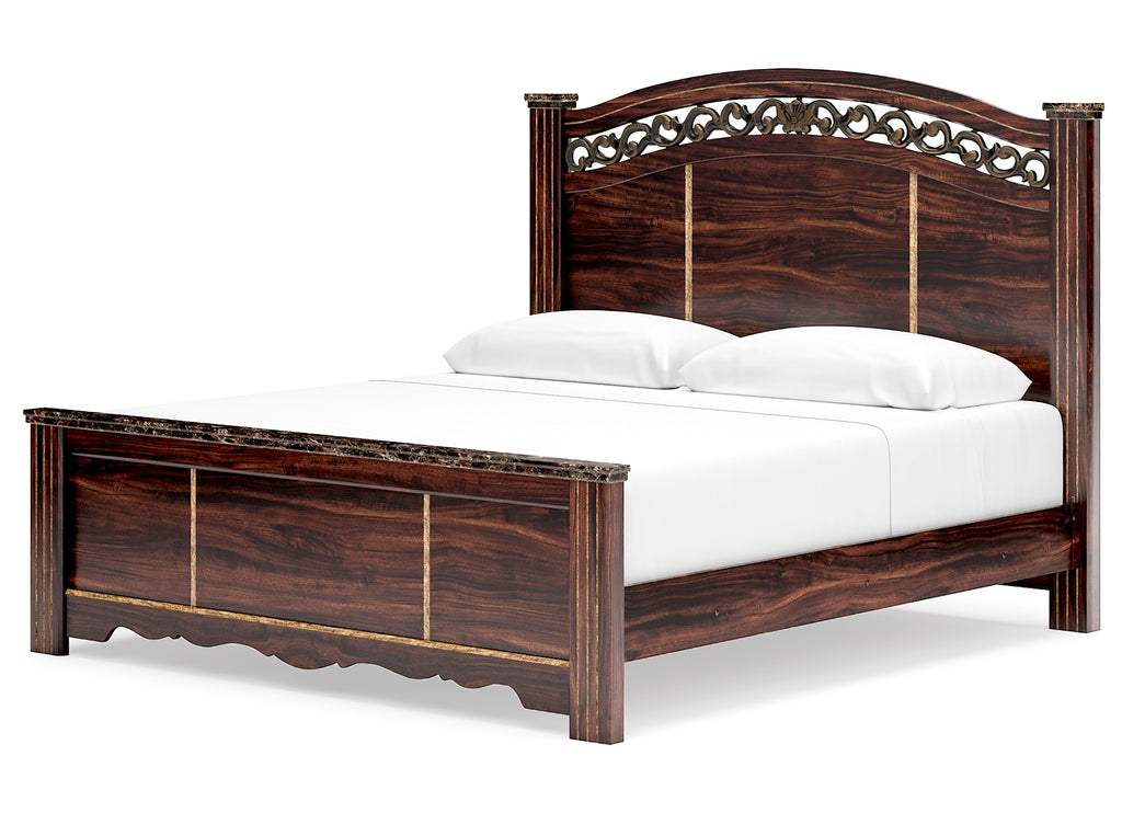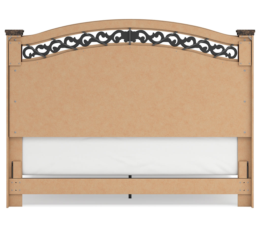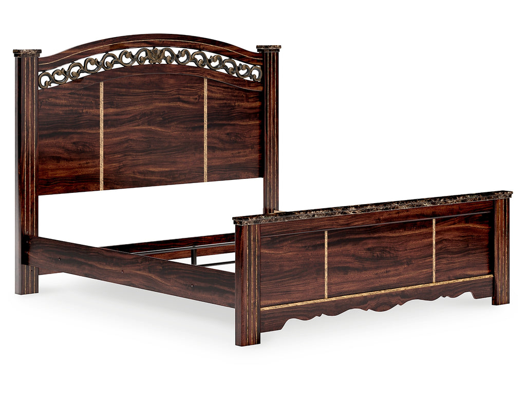Timeless and classic, this king poster bed offers a grand design accented with rich hues and eye-catching details. Stately from every angle, its sophisticated elements blend together to display your love of traditional aesthetics. The headboard further elevates the look with ornate detailing at its crown. | Product Features