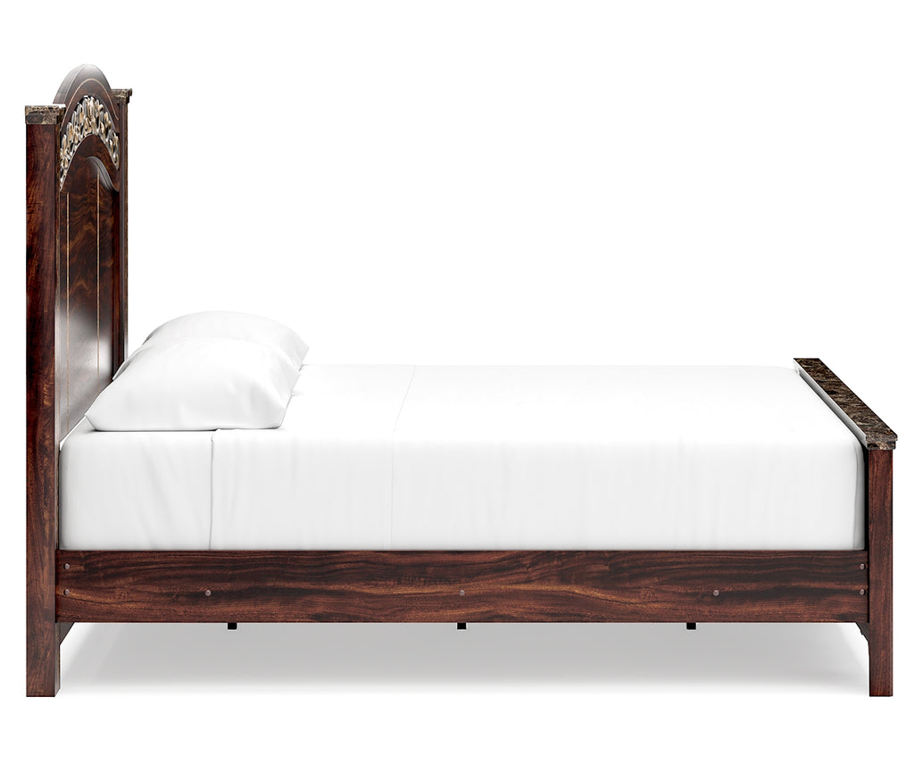 - Glossy reddish-brown finish over replicated cherry grain, paired with faux stone