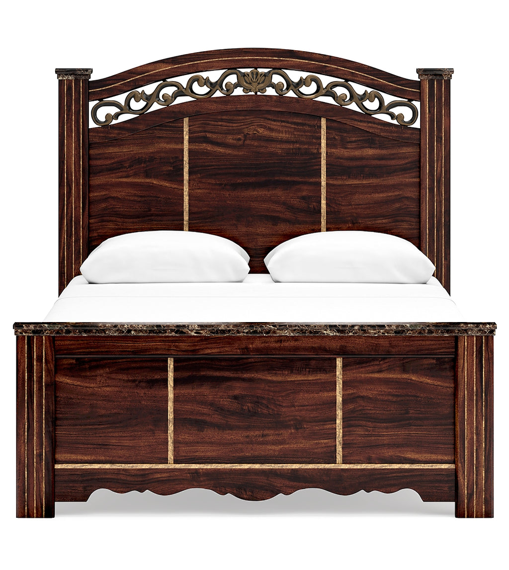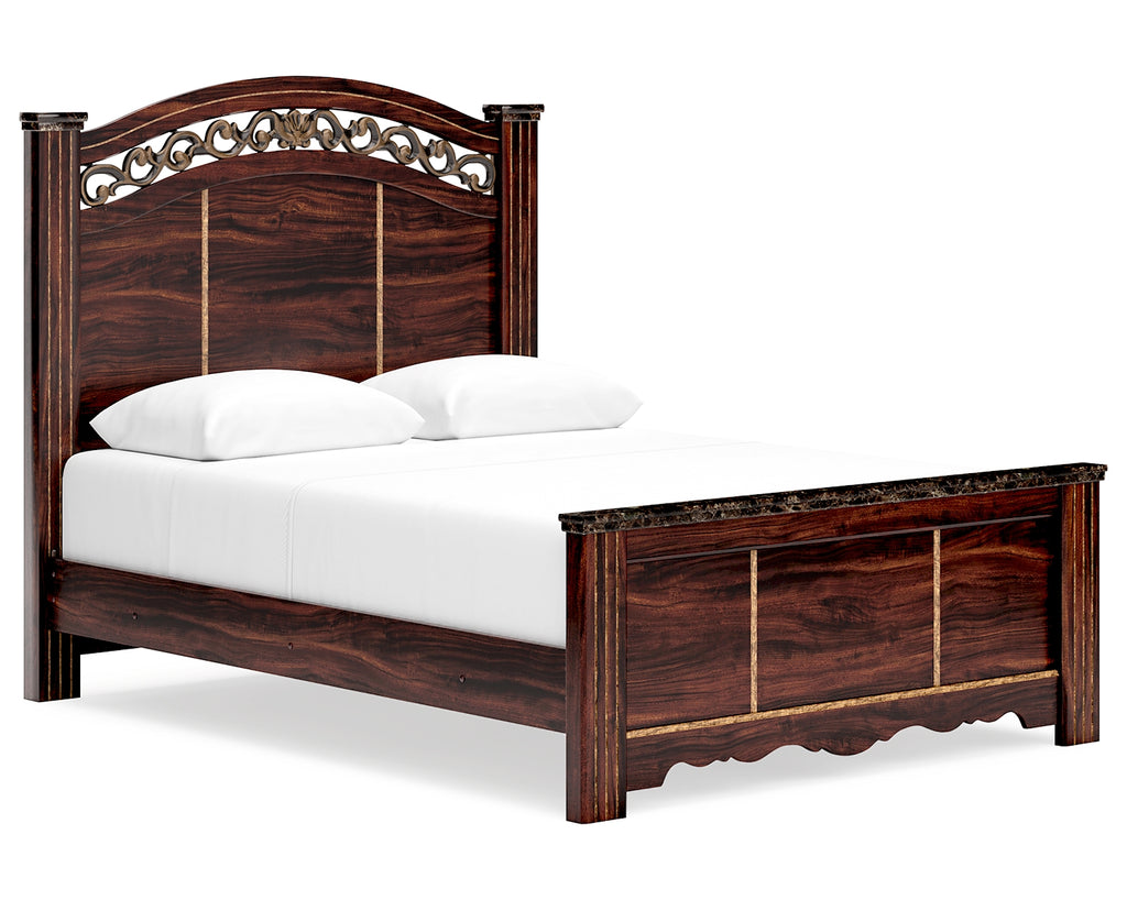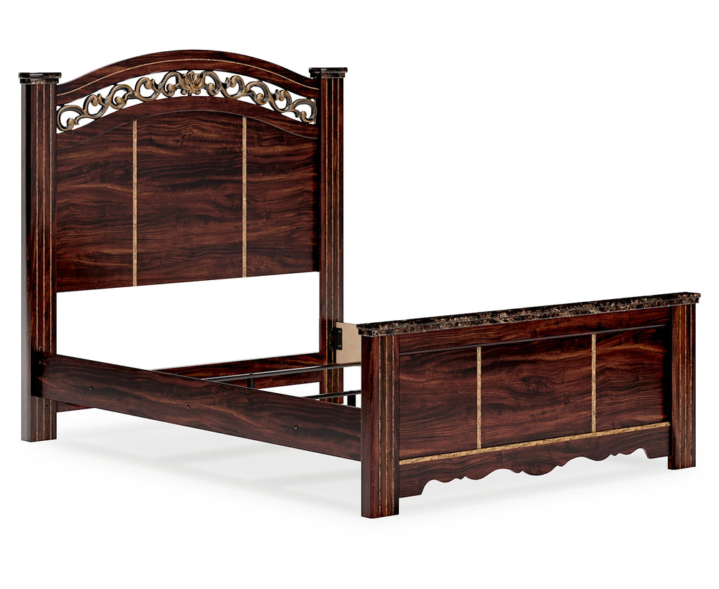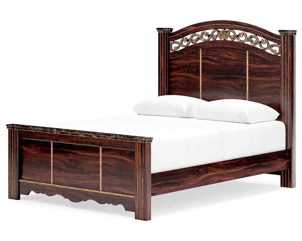 Timeless and classic, this queen poster bed offers a grand design accented with rich hues and eye-catching details. Stately from every angle, its sophisticated elements blend together to display your love of traditional aesthetics. The headboard further elevates the look with ornate detailing at its crown. | Product Features