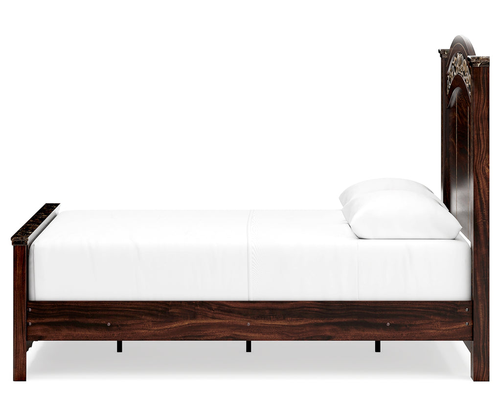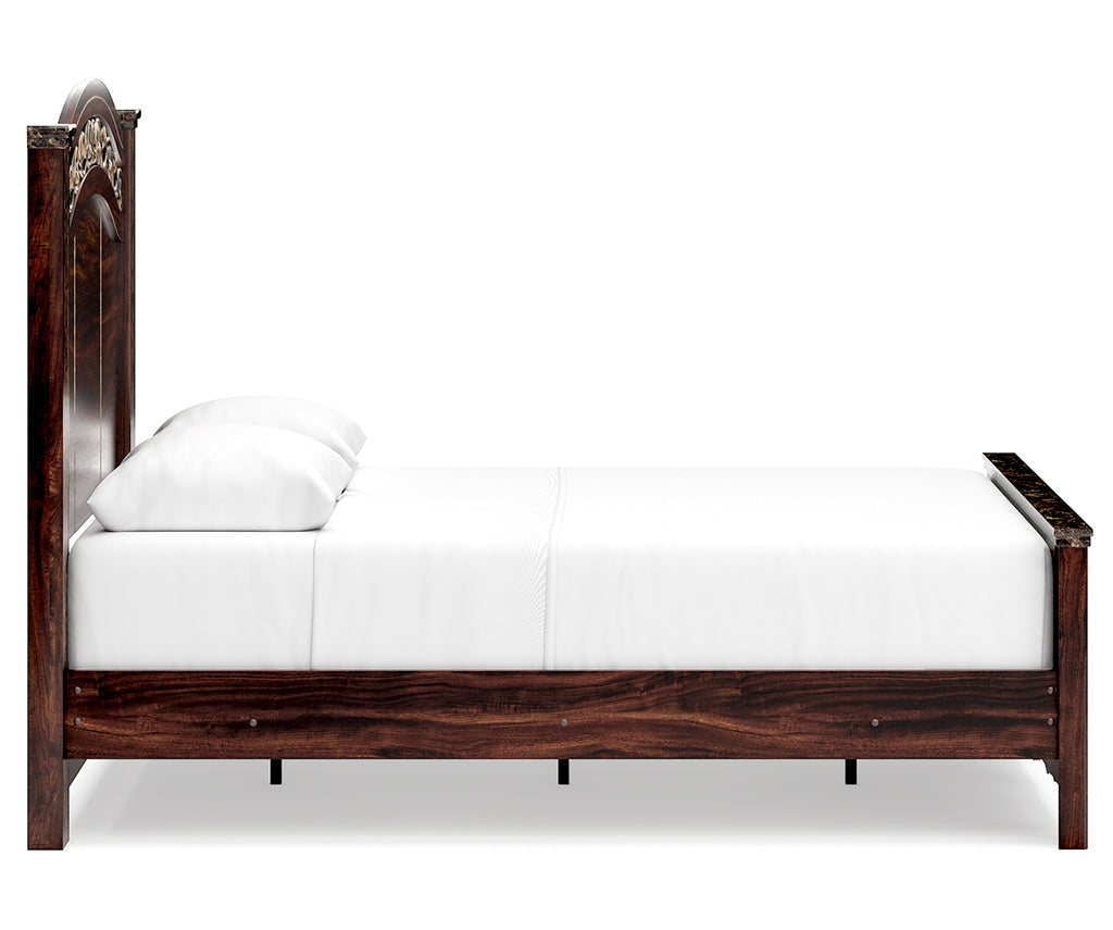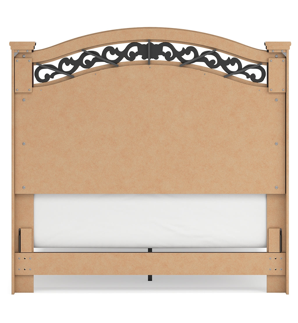 Timeless and classic, this queen poster bed offers a grand design accented with rich hues and eye-catching details. Stately from every angle, its sophisticated elements blend together to display your love of traditional aesthetics. The headboard further elevates the look with ornate detailing at its crown. | Product Features