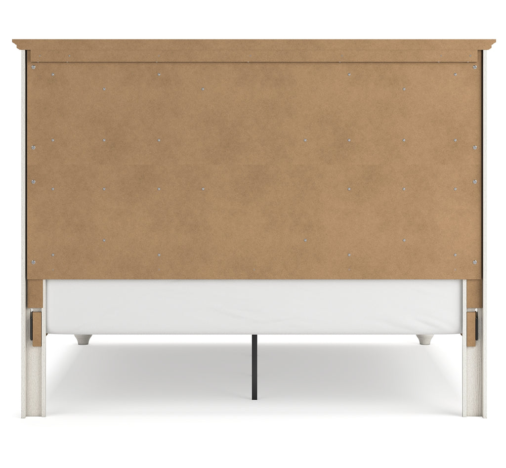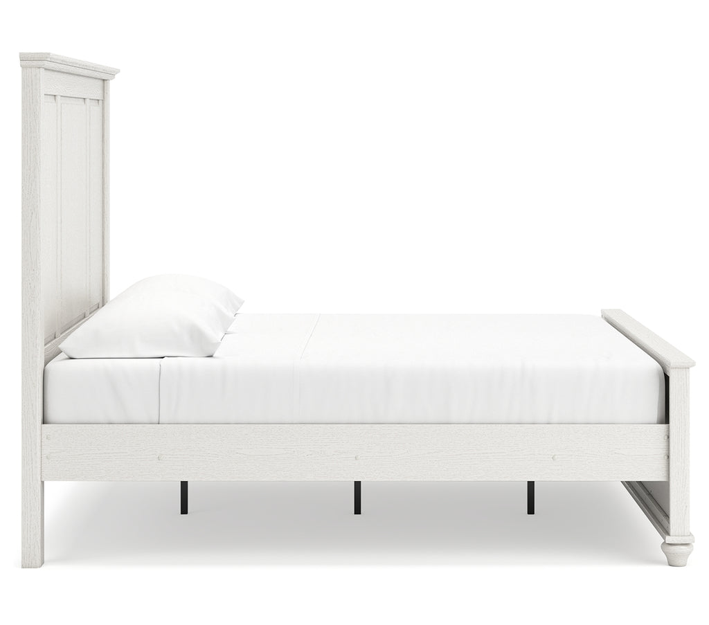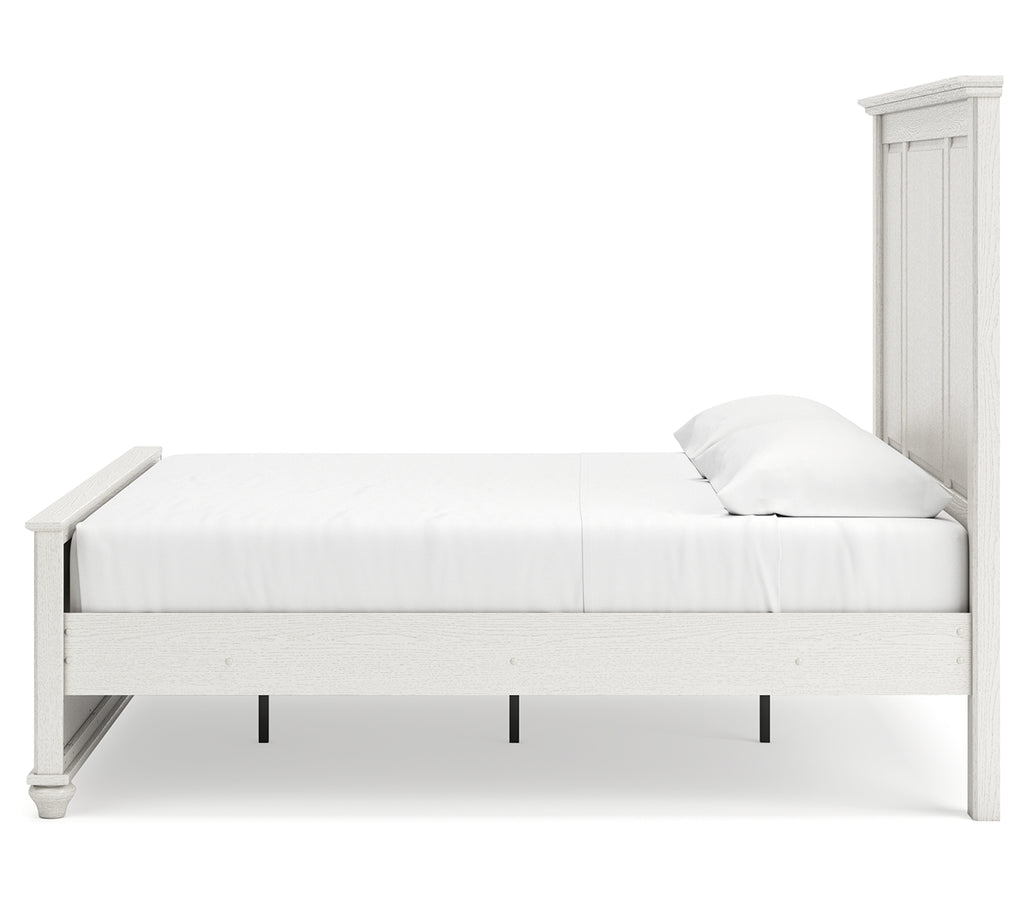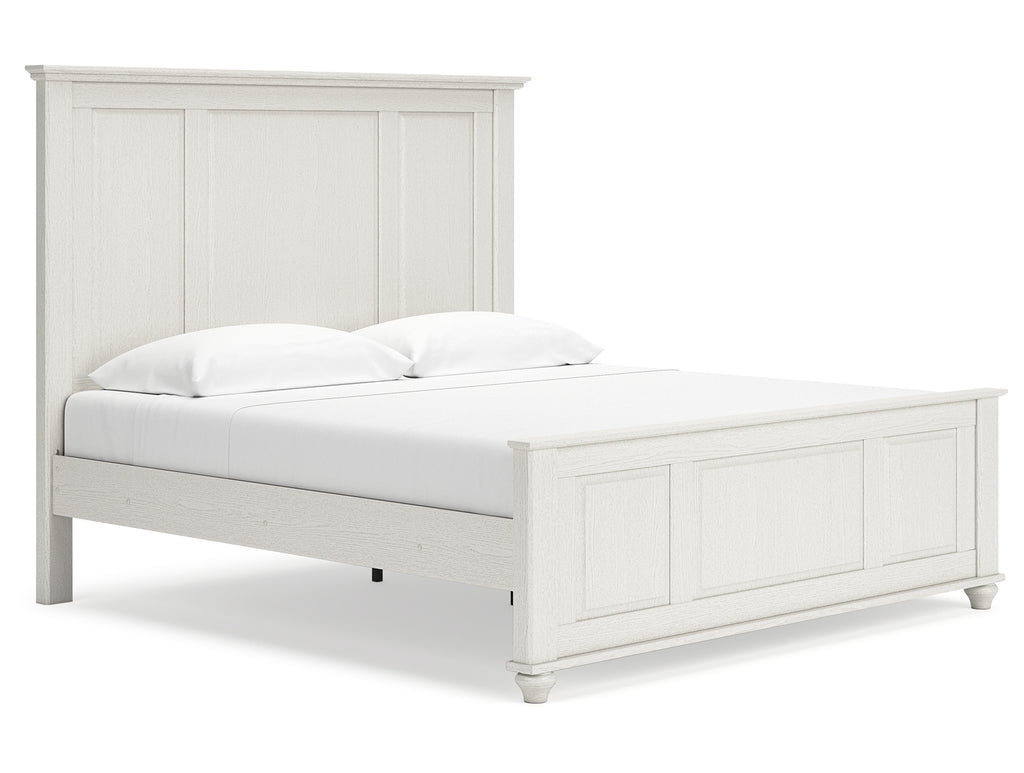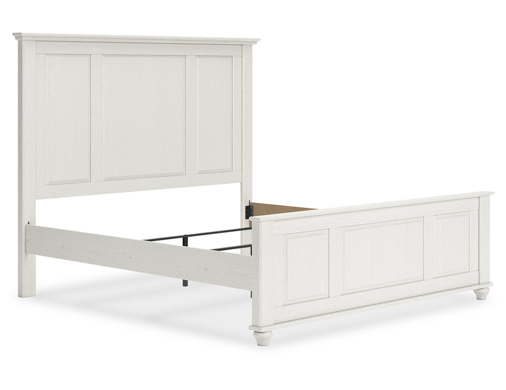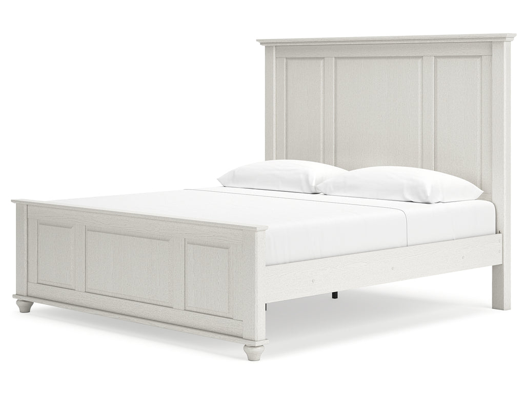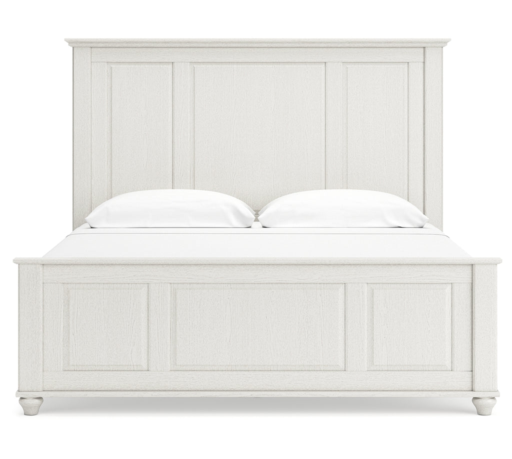 Brighten up your bedroom with this king panel bed. It delights with a soft white finish and cottage-quaint styling. Crown moulding and inset panels add dimension and a traditional touch. When done in the right color, even a simple design can take on a fashionable flair. | Product Features