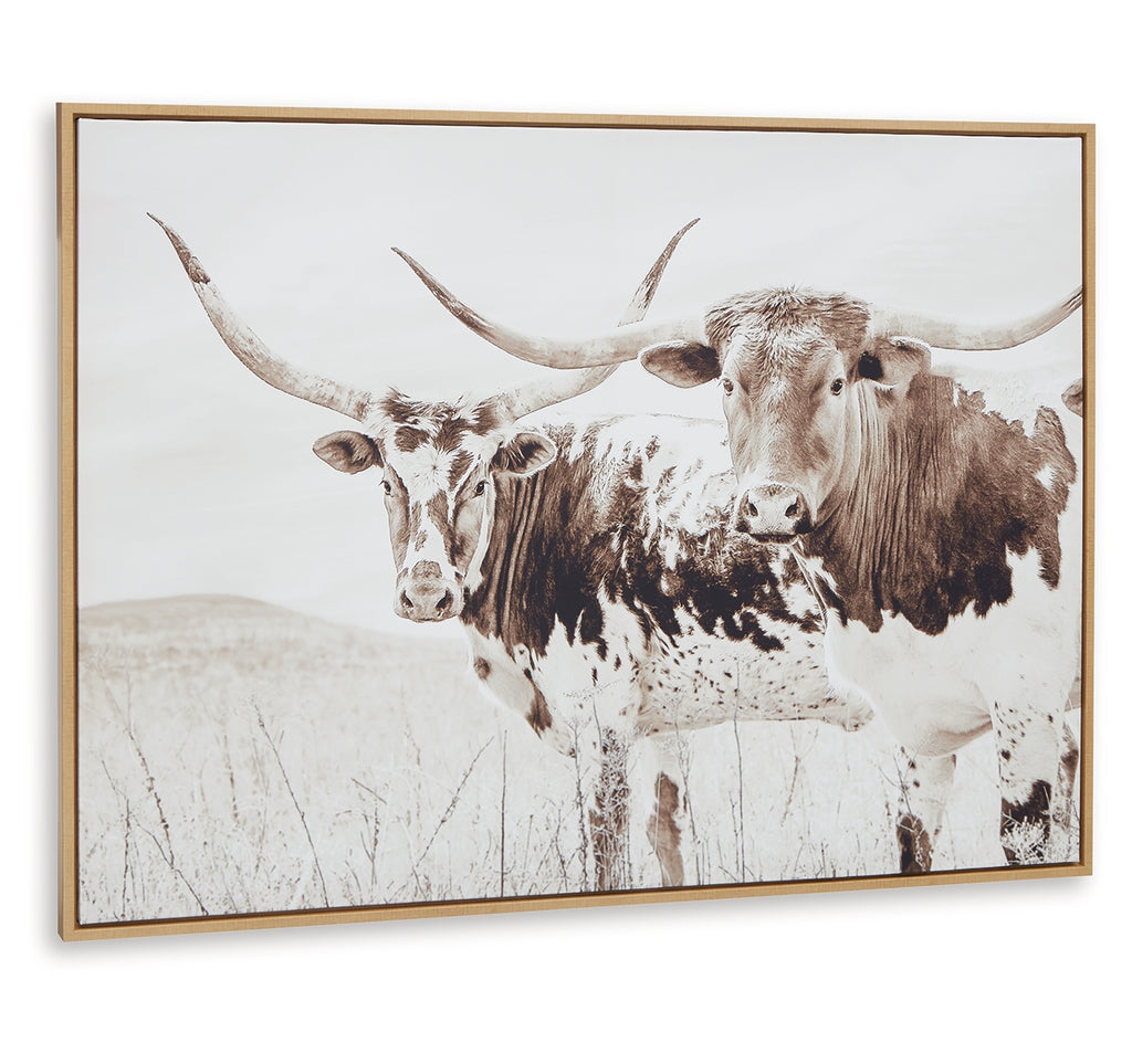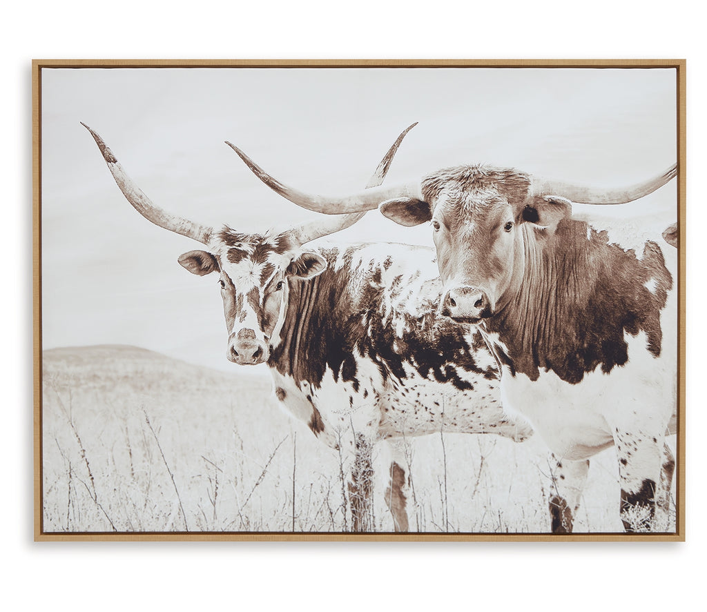 Create an idyllic feel in your interior with this wall art. A peaceful portrait of longhorn cows roaming the countryside, the sepia-toned piece has a vintage vibe well-suited to casual and farmhouse aesthetics. Its natural charm is a welcome addition to existing wall decor, and it also makes an effortlessly chic accent when hung alone.