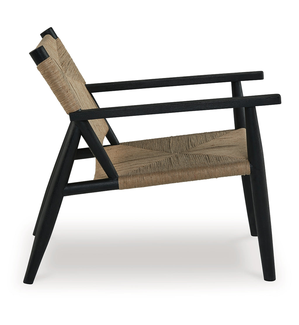 Understated style done beautifully well. This accent chair's natural jute upholstery offers a striking contrast with its black wood frame. Combining a contemporary aesthetic with a mid-century vibe, it's ideal for the living room or bedroom. | Product Features