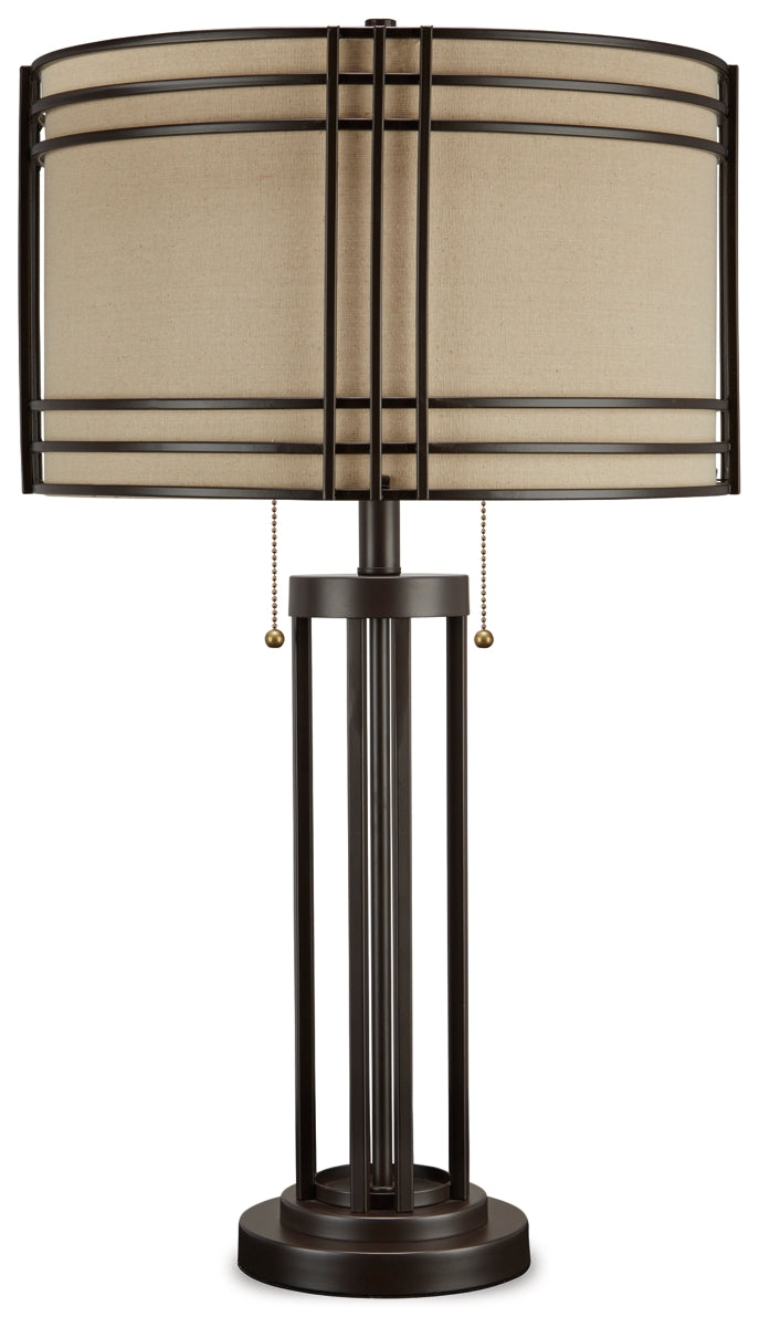 Add a touch of rustic industrial style to your decor with this eye-catching table lamp. Its drum shade and decorative metal frame bring an appealing touch to your home. A dark brown finish complements the shade's lighter neutral color, making this lamp ideal for enhancing casual urban living space decor. | Product Features