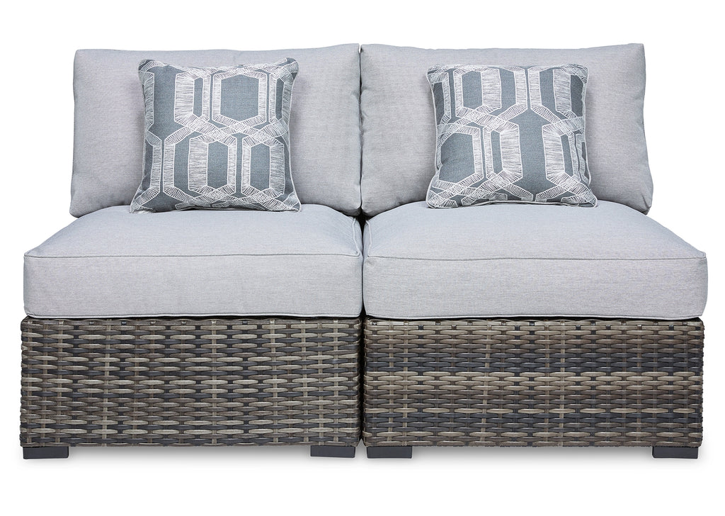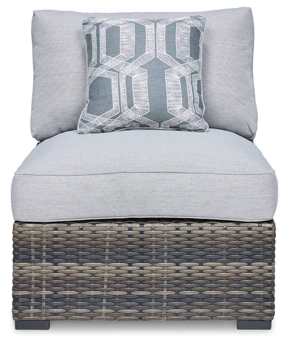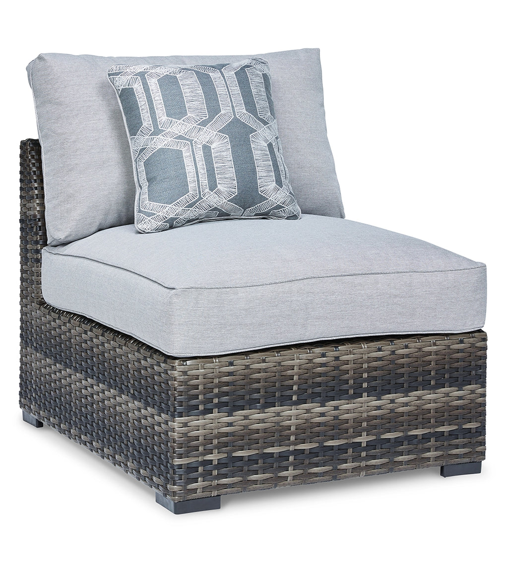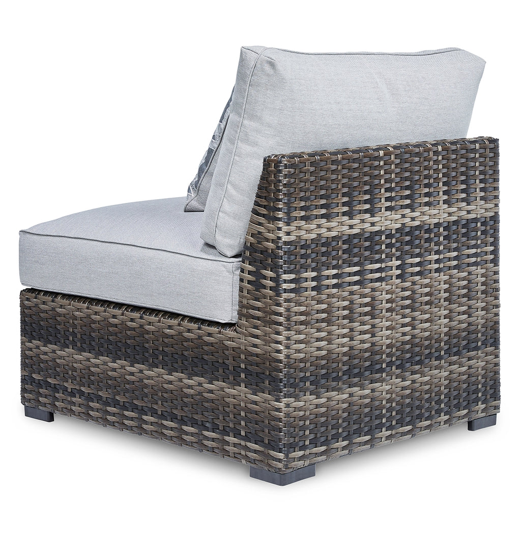 This cool, casual outdoor chair will raise the comfort level and visual appeal of your outdoor living space. Made of handwoven wicker in neutral tones of light and dark gray, the armless chair blends beautifully into your lanai or pool and patio area with thick, comfy cushions wrapped in Nuvella® high performance fabric that is stain resistant, fade resistant and easy to clean. This cushioned armless chair can be used on its own or paired with other pieces of the matching sectional to create a space that holds up to Mother Nature and ages gracefully for years of enjoyment. | Product Features
