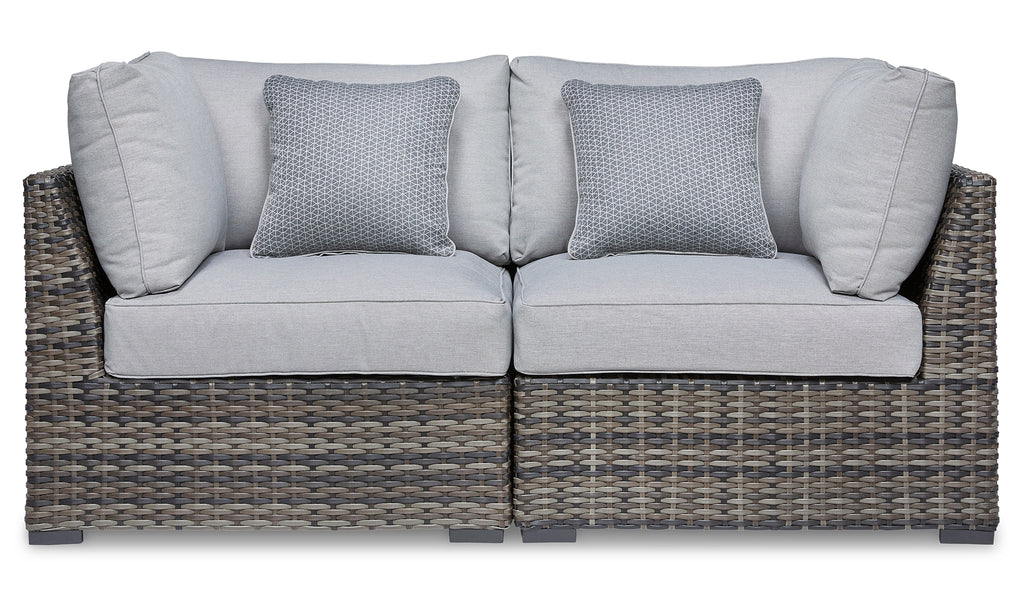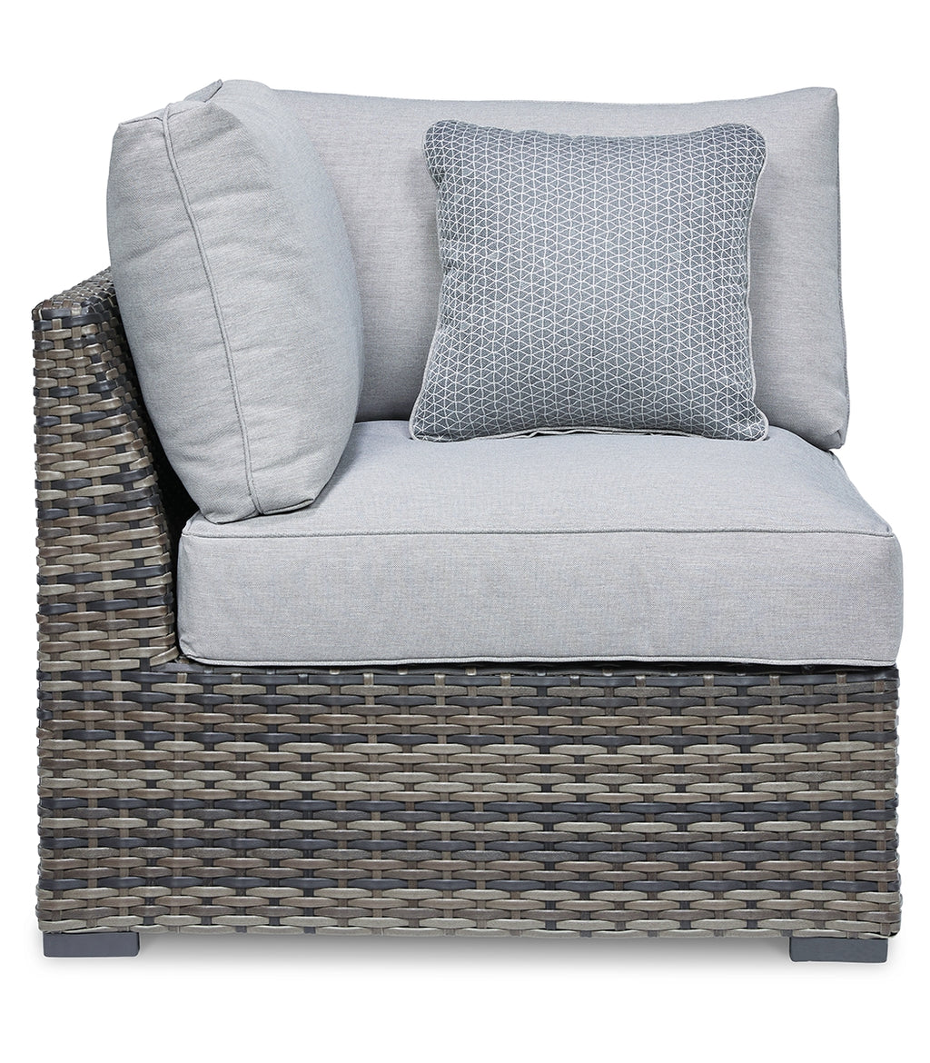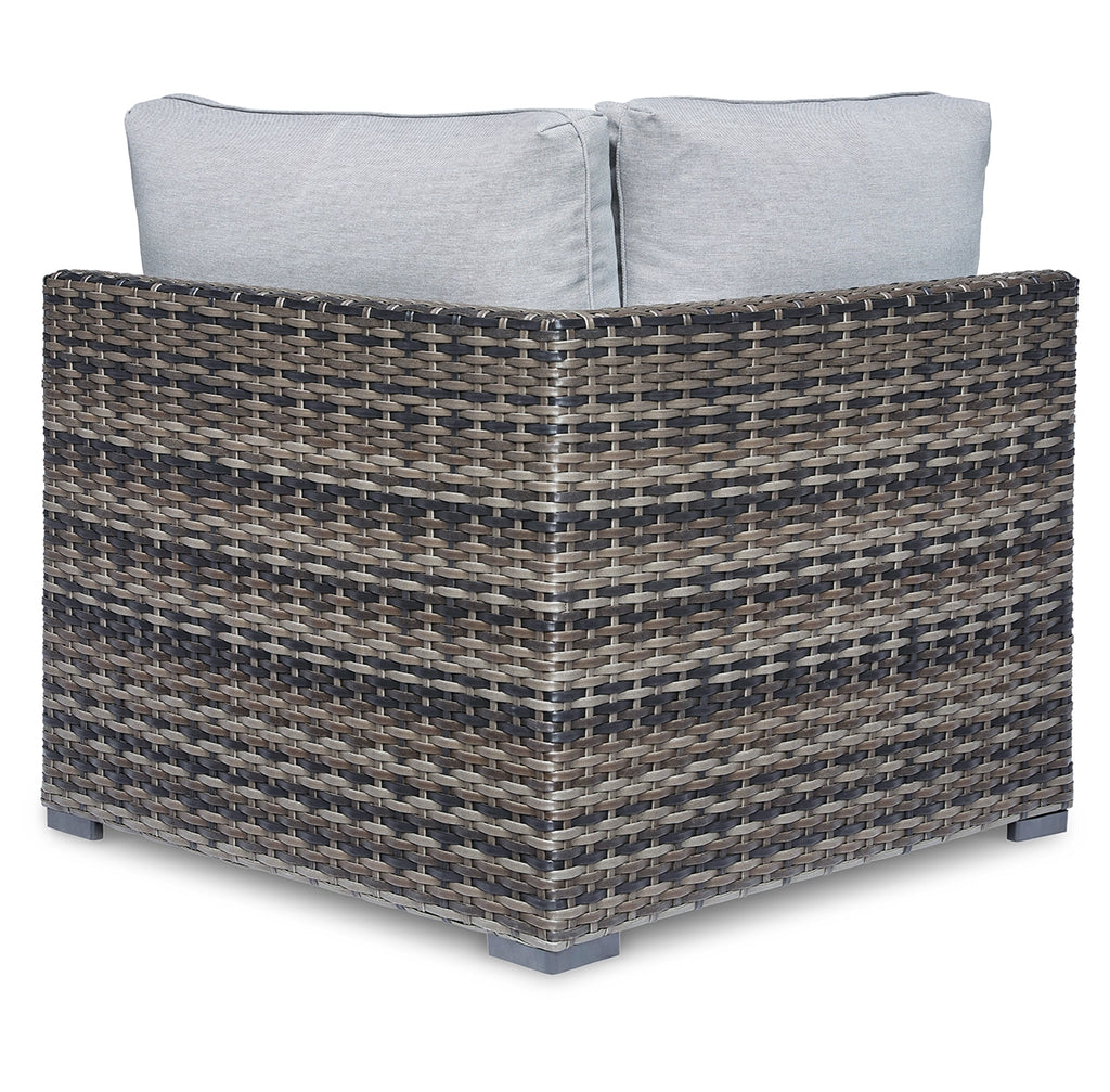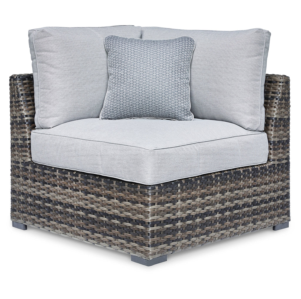 This cool, casual outdoor chair will raise the comfort level and visual appeal of your outdoor living space. Made of handwoven wicker in neutral tones of light and dark gray, the cushioned corner chair blends beautifully into your lanai or pool and patio area with thick, comfy cushions wrapped in Nuvella® high performance fabric that is stain resistant, fade resistant and easy to clean. It can be used on its own or paired with other pieces of the matching sectional to create a space that holds up to Mother Nature and ages gracefully for years of enjoyment. Four pillows are thrown in for added comfort and a splash of color. | Product Features