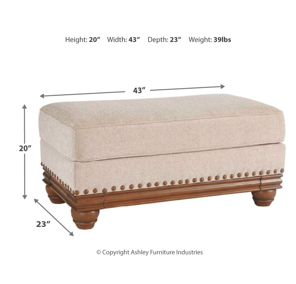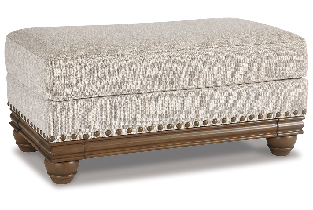 True classic character comes to life in this ottoman. Warm brown exposed frame with bun feet is beautifully traditional. Lovely detailing carries itself through the herringbone weave in the soft upholstery. Neutral tone lets you accessorize with any color. Vintage-inspired jumbo nailhead trim graces the design all around. |