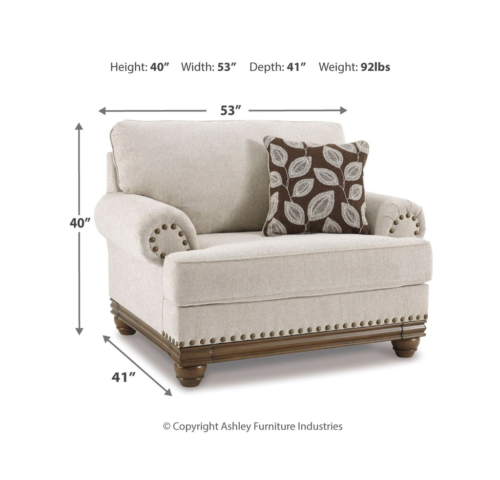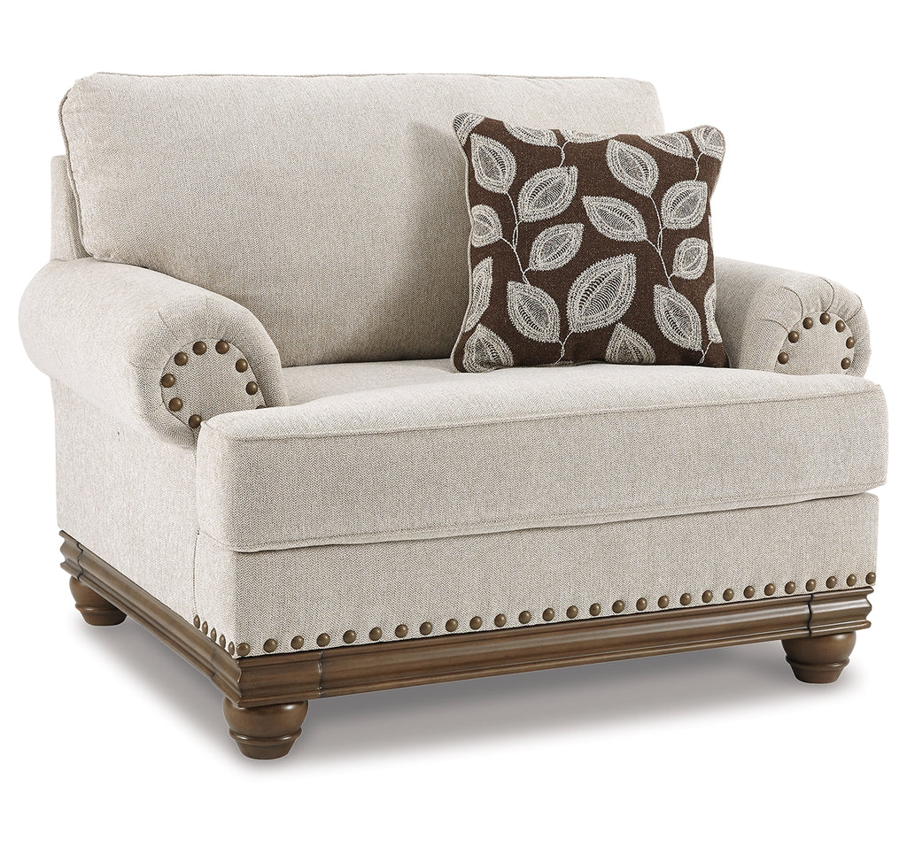 True classic character comes to life in this oversized chair with room for two to sit. Set back pleated rolled arms and warm brown exposed frame with bun feet are beautifully traditional. Lovely detailing carries itself through the herringbone weave in the soft upholstery. Seat cushion reverses to maintain durable comfort. Vintage-inspired jumbo nailhead trim graces the design. Botanical pillow in dark brown is a timeless touch. | Product Features