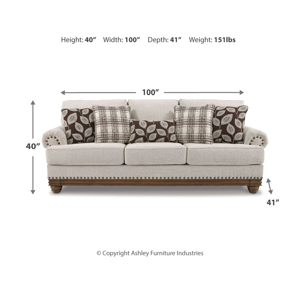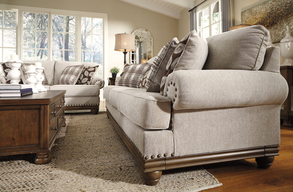 True classic character comes to life in this sofa. Set back pleated rolled arms and warm brown exposed frame with bun feet are beautifully traditional. Lovely detailing carries itself through the herringbone weave in the soft upholstery. Seat cushions reverse to maintain durable comfort. Vintage-inspired jumbo nailhead trim graces the design. Plaid and botanical pillows in dark brown are a timeless touch. | Product Features