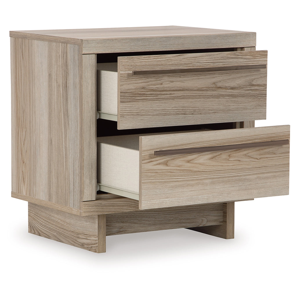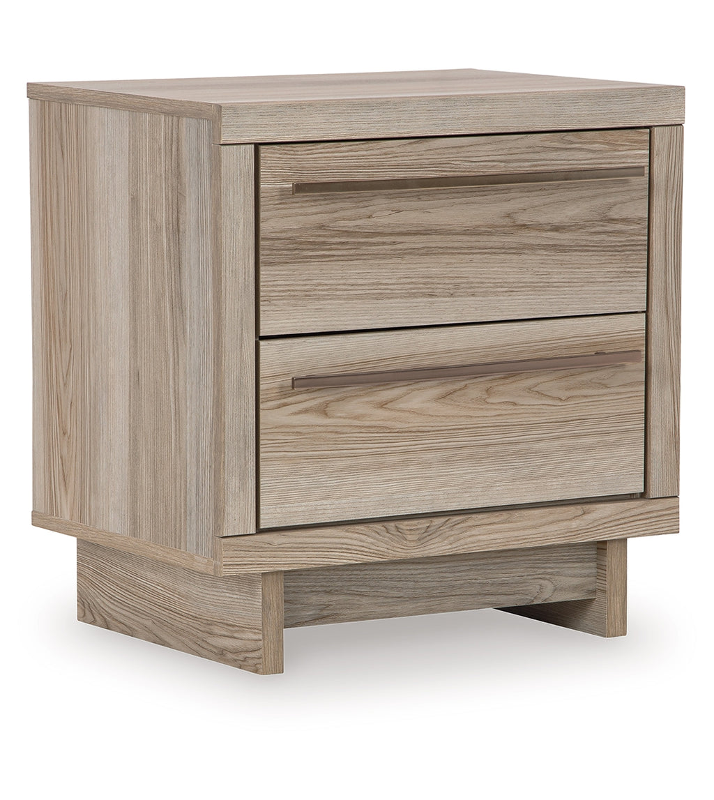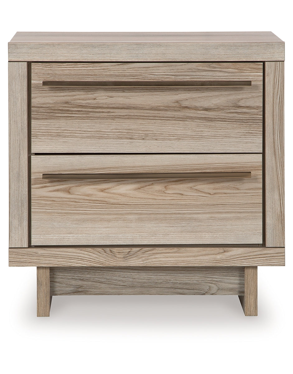 Modern meets neutral and sophisticated in this nightstand. Its natural finish, subtle replicated wood grain and clean lines wake up your bedroom with eye-catching appeal. The generous storage space in its smooth-gliding, lined drawers brings function to relaxed refinement. Elongated handles in a champagne tone speak casual simplicity, creating a smart and stylish bedroom retreat. USB and wireless charging options make powering up your electronics a snap. | Product Features