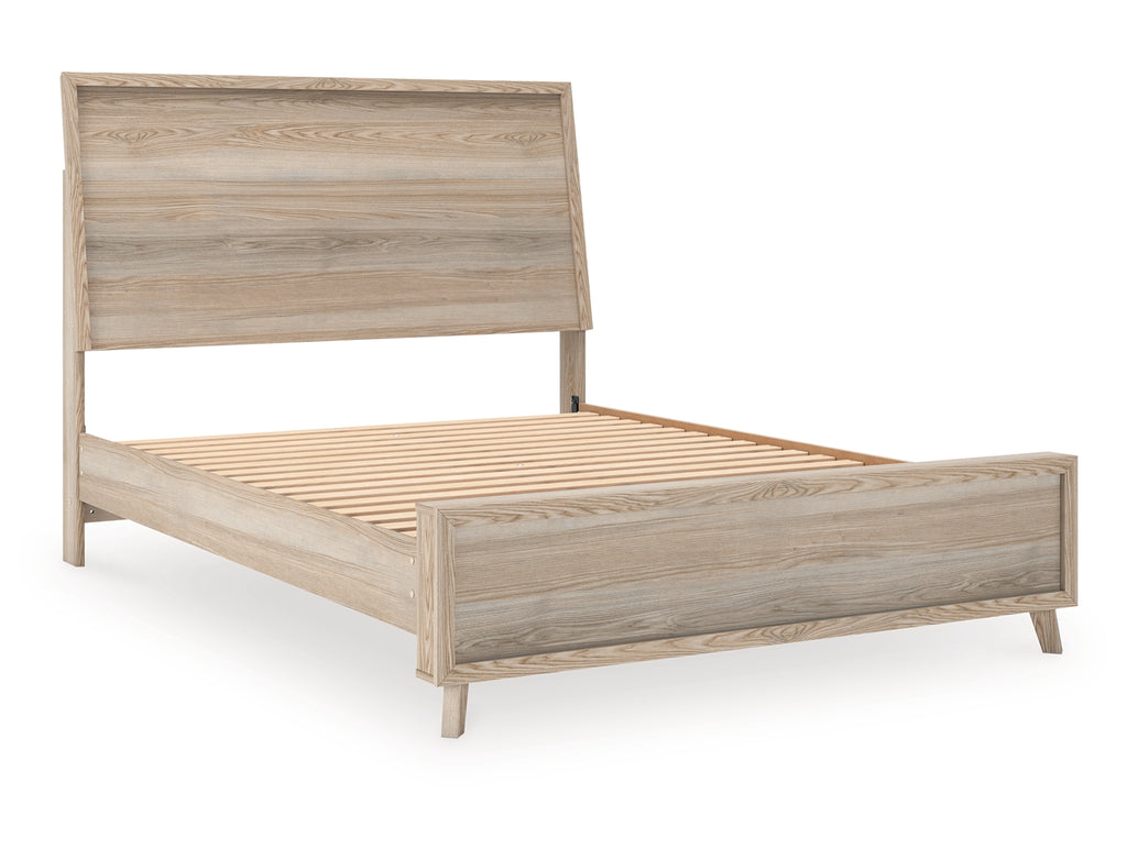 Modern meets neutral and sophisticated in this queen panel bed. Its clean lines and open slat headboard wake up your bedroom with eye-catching appeal. The natural finish and subtle replicated wood grain speak casual simplicity, creating a smart and stylish bedroom retreat. A refreshing take on style, indeed. | Product Features