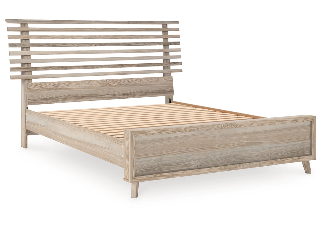 Modern meets neutral and sophisticated in this queen slat panel bed. Its clean lines and open slat headboard wake up your bedroom with eye-catching appeal. The natural finish and subtle replicated wood grain speak casual simplicity, creating a smart and stylish bedroom retreat. A refreshing take on style, indeed. | Product Features