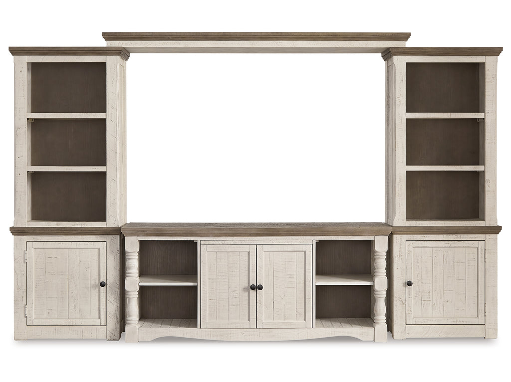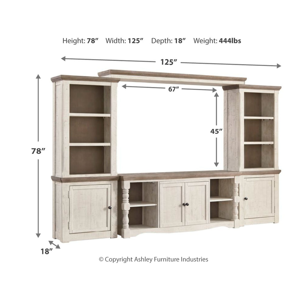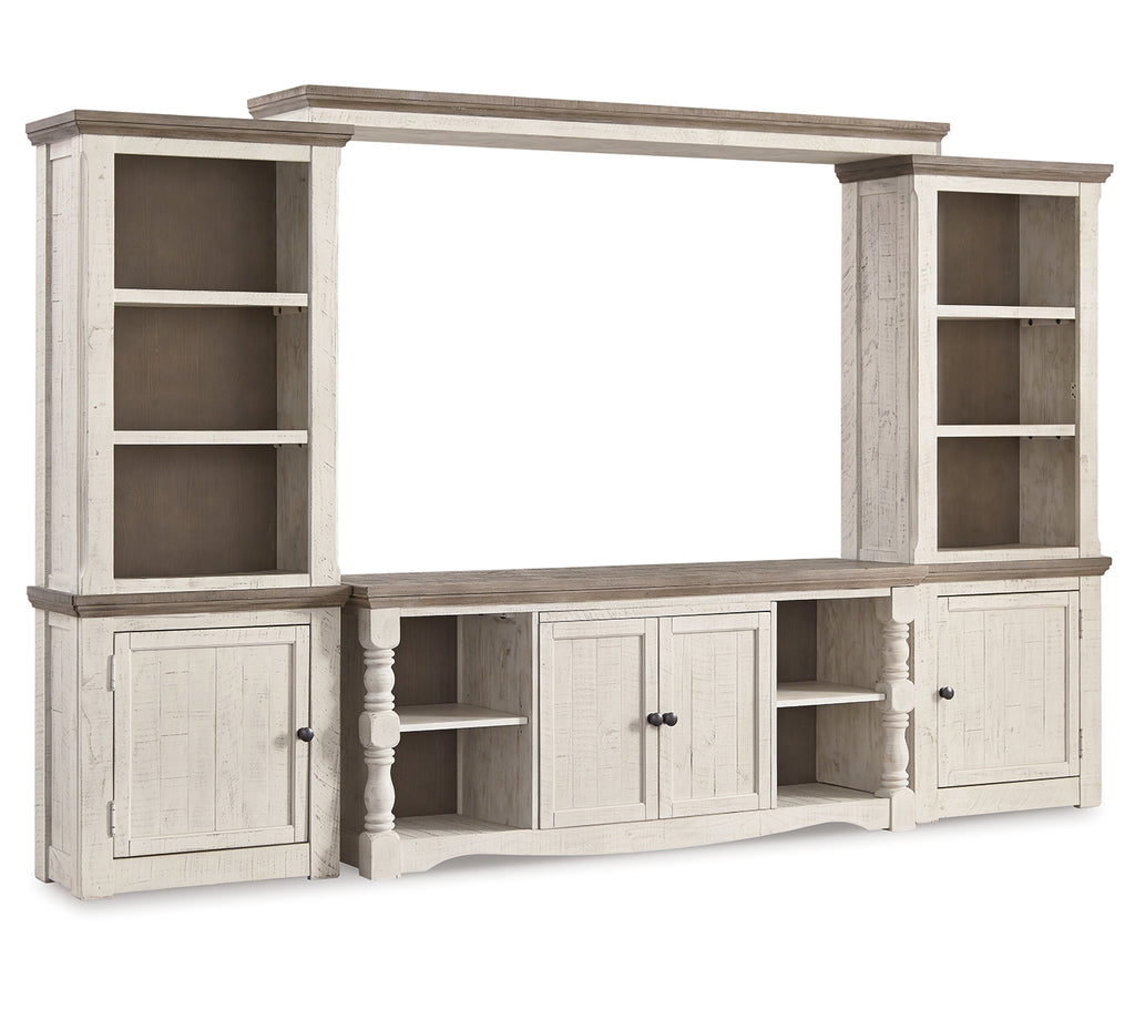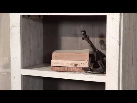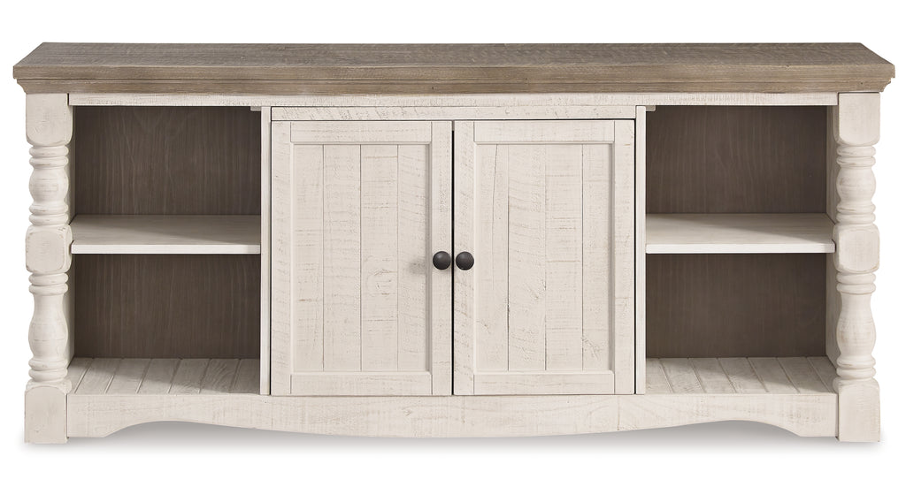 Set your sights on modern farmhouse style with this entertainment center. Distressed two-tone treatment blends a weathered gray with vintage white for an utterly charming effect. Turned posts lend a hearty, substantial look that feels right at home, while plenty of open shelving makes the aesthetic anything but heavy.