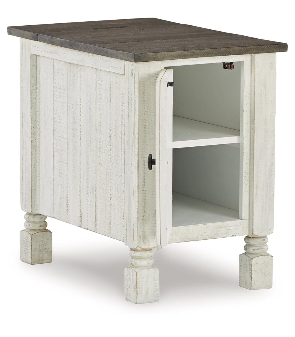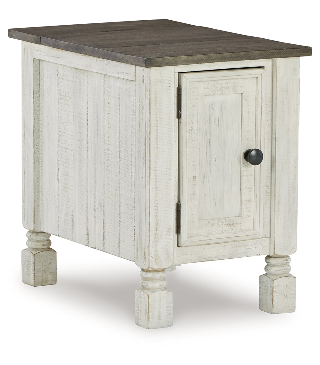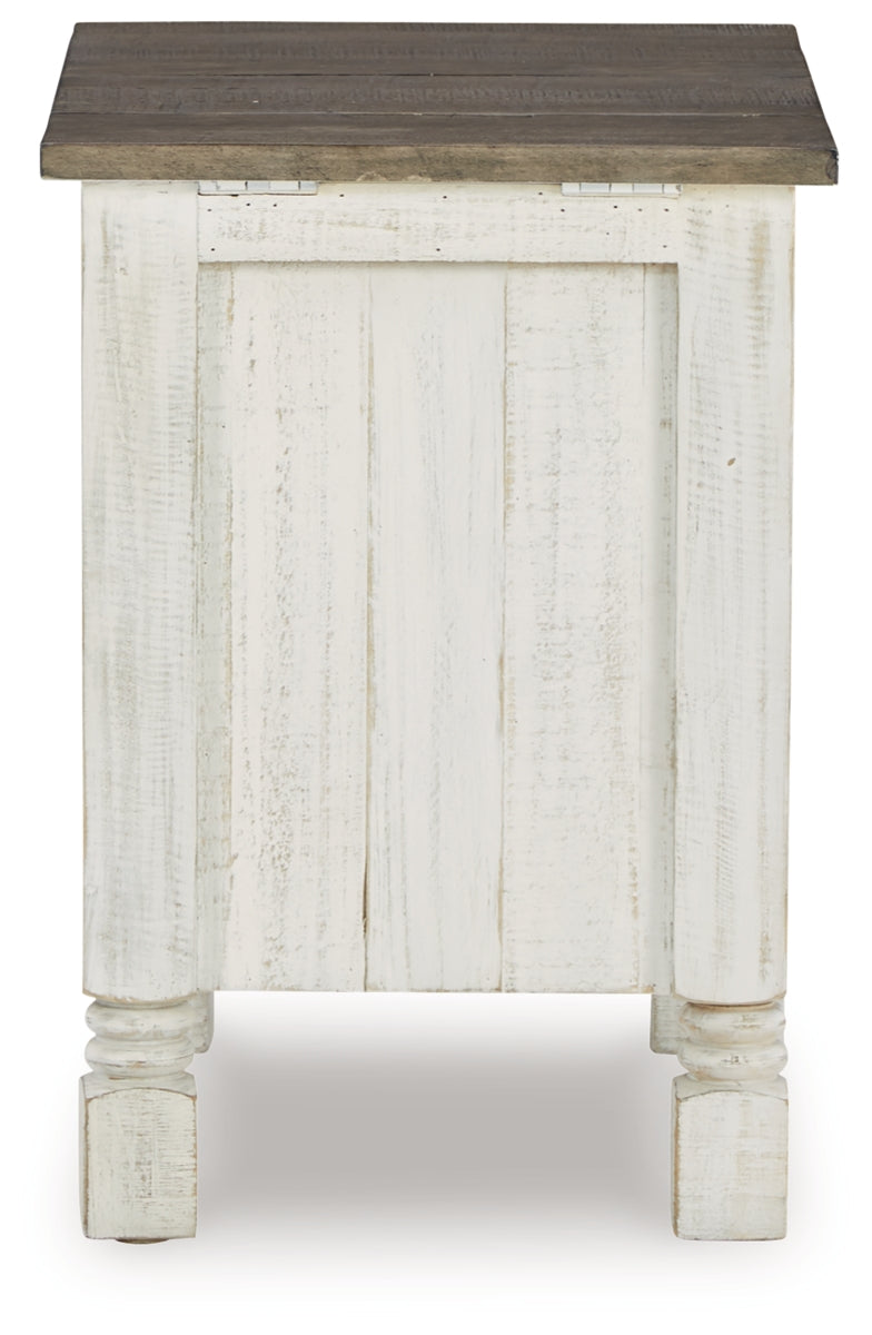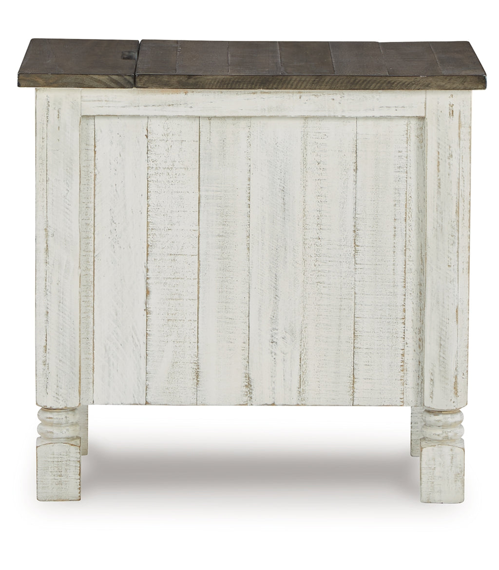 What a fresh interpretation of country classic style. Inspired by American farmhouse craftsmanship, but with an elevated sensibility, this chairside end table blends distinctive details such as turned post accents and raised door fronts for a substantial look that feels right at home. Those who appreciate rustic character should take note of the table’s thick crown moulding, beautified with a vintage two-tone finish. A small flip lid located on the top conceals a power outlet and USB ports to keep electronics charged up and close at hand | Product Features
