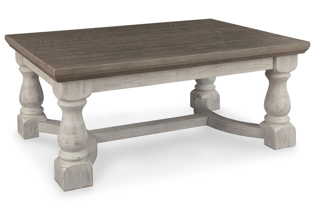 With its richly rustic finish and textural mix, this coffee table goes to town on bygone beauty. Its distressed two-tone treatment blends a weathered gray with vintage white for an utterly charming effect. Robust legs lend a hearty, substantial look that feels right at home. | Product Features