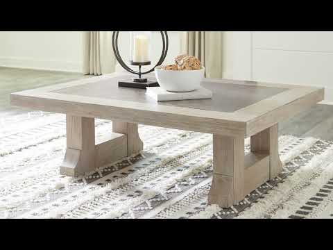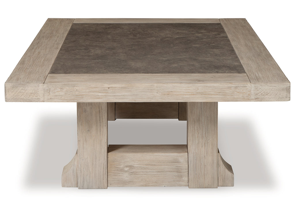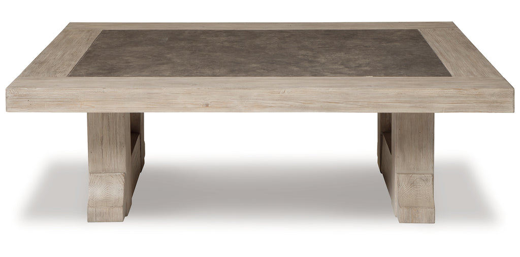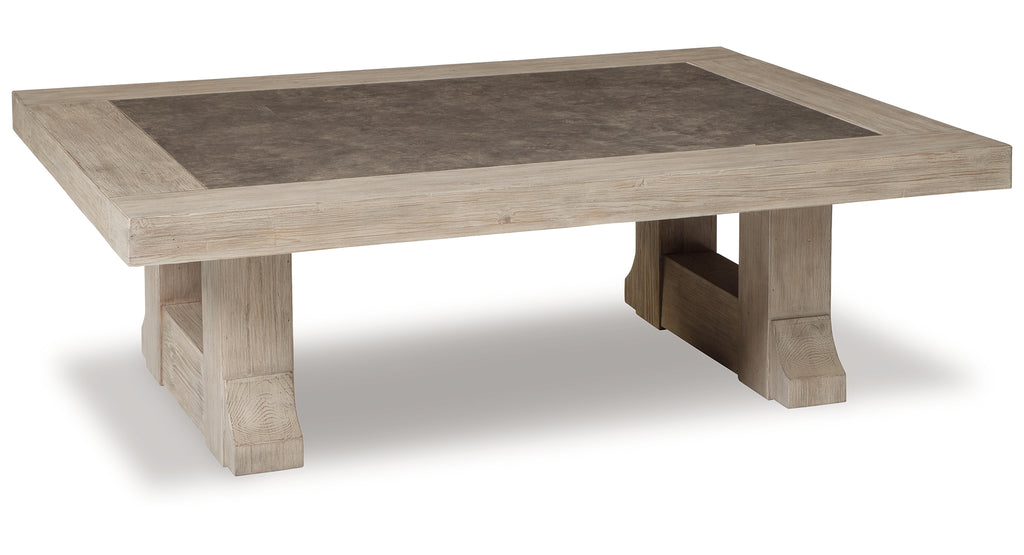 A striking example of rustic refinement, this coffee table is generously scaled to accommodate your entertainment needs with ease. Made with pine wood and veneer beautified with a complex bisque finish, this designer coffee table includes a top with melamine inset for mixed-media interest.