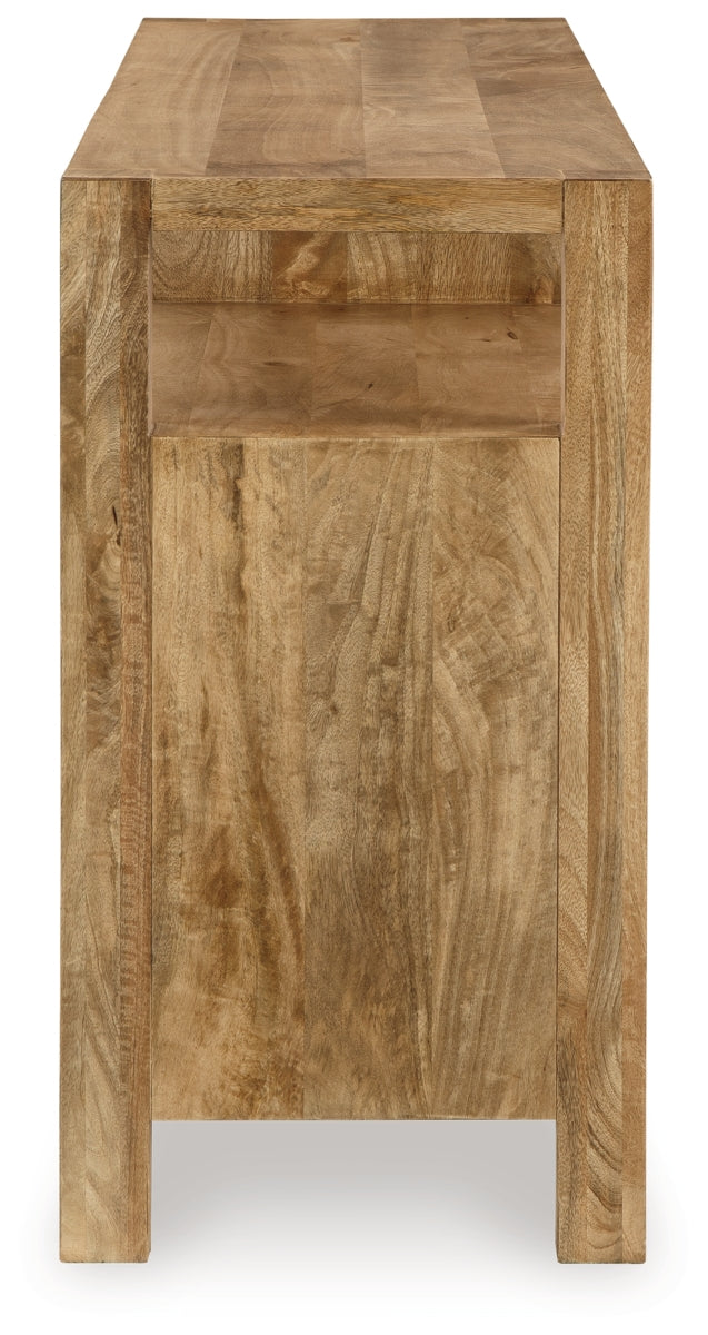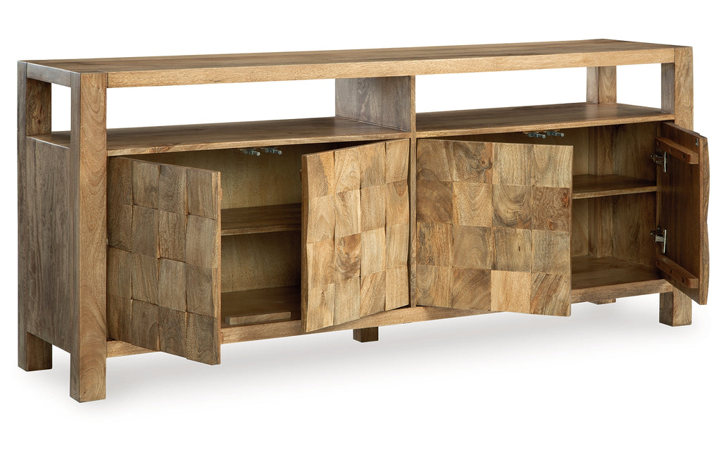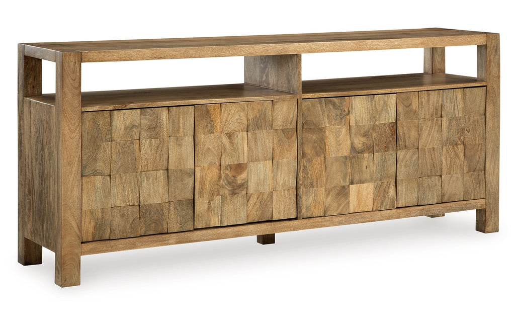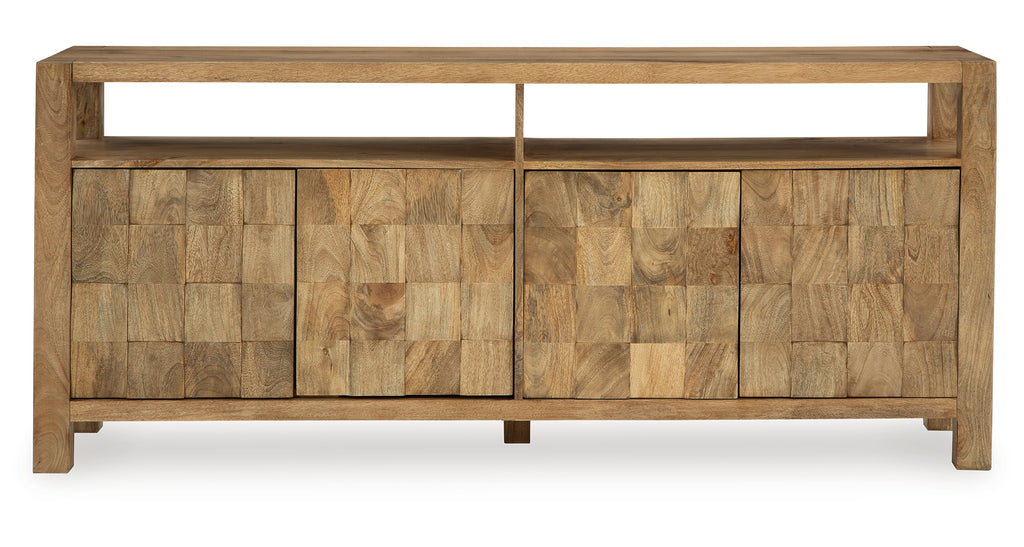 How many squares do you see? They’re laid out in casually cool style on this accent cabinet. The block-patterned door fronts and natural brown finish add dimension and a laid-back aesthetic to your storage needs. Look behind the push magnet doors for two adjustable shelves, giving function to form. (We counted 64 squares, by the way.) | Product Features