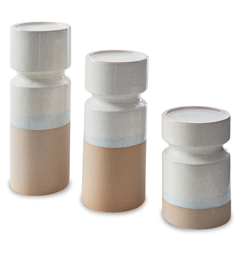 Exuding a sense of earthy elegance, this candle holder set is one tantalizing trio. With their varying heights, these candle holders permeate just the right ambiance when displayed individually or in a group. They're finished with a reactive glaze—a technique admired for its variegated coloring—so each is one of a kind. | Product Features