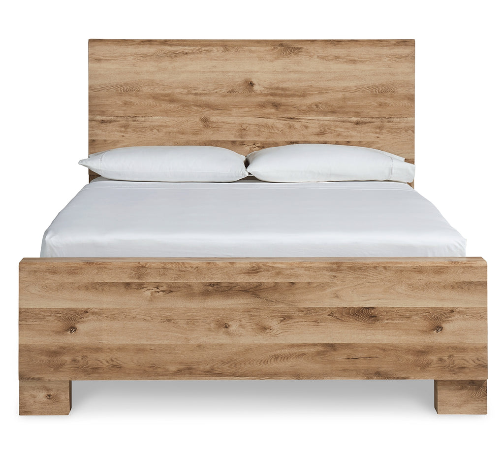 Inspired by natural beauty, refined to perfection. This king panel bed brings cozy outdoor vibes to your bedroom with its warm and inviting golden rustic finish. Simple and streamlined, the piece adds a subtle touch of authentic style to your space. | Product Features