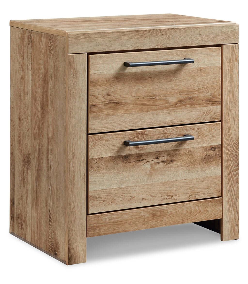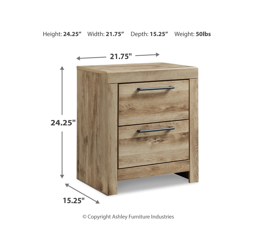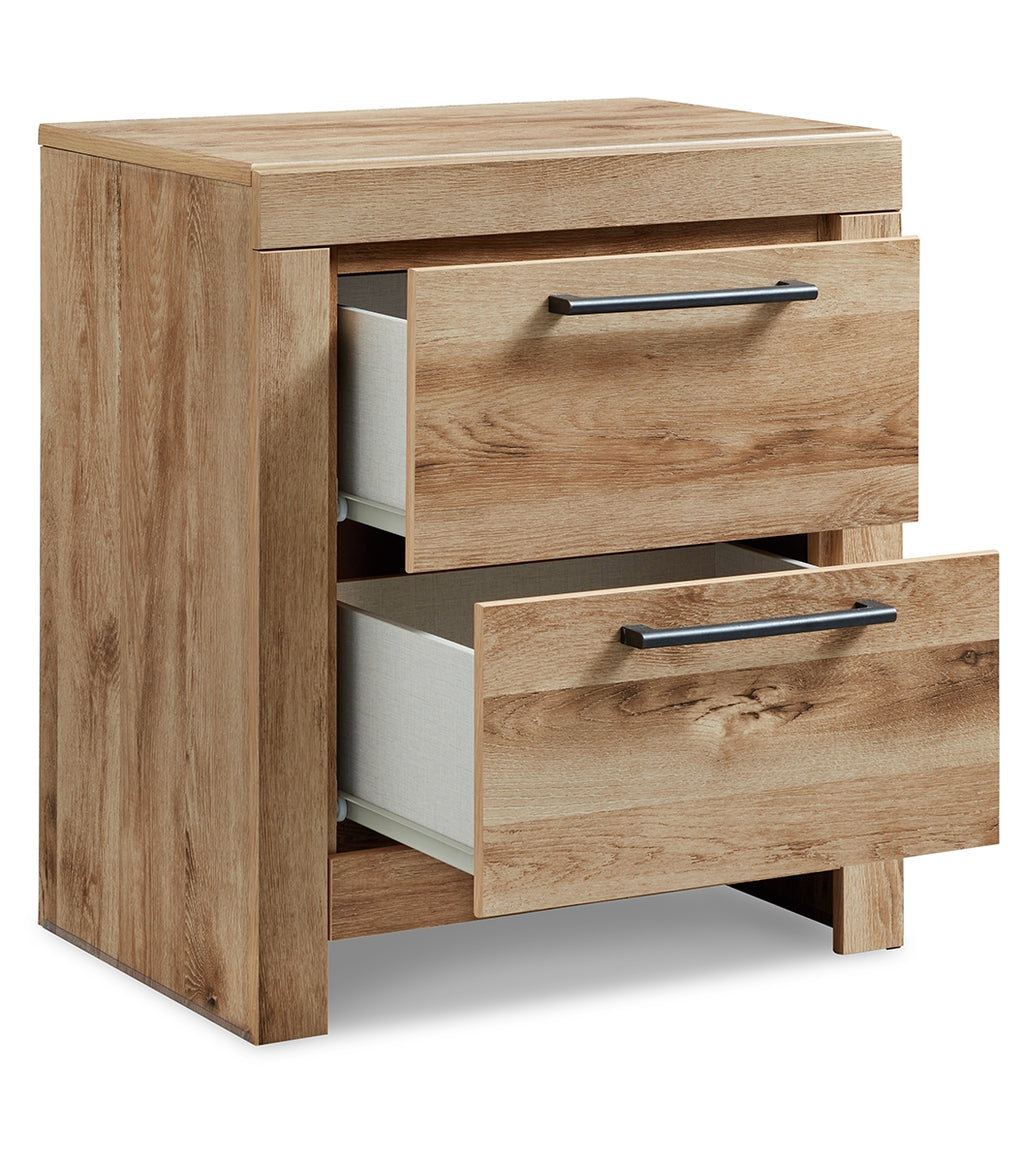 Inspired by natural beauty, refined to perfection. This nightstand brings cozy outdoor vibes to your bedroom with its warm and inviting golden rustic finish. Antiqued gunmetal handles adorn the two drawers on its framed front for an industrial touch, while USB charging adds a high-tech element to the simple, streamlined design. | Product Features