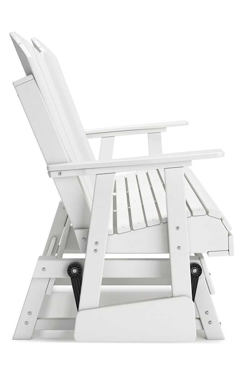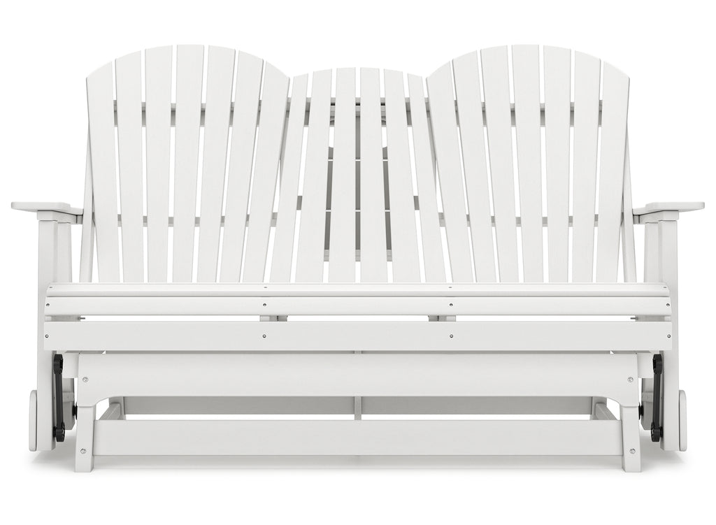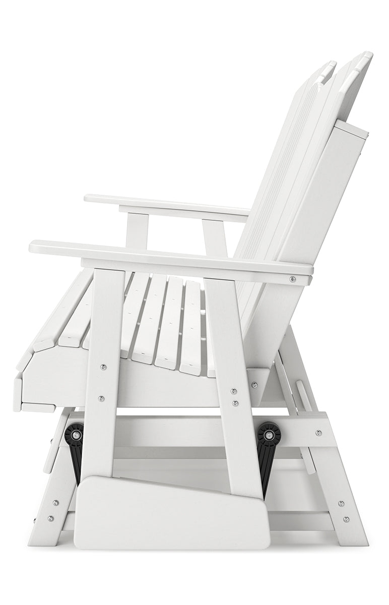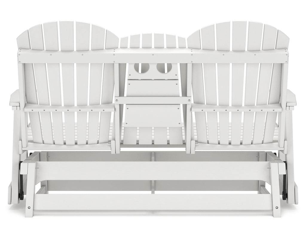 Drift away from everyday worries and into outdoor bliss with this glider loveseat. Dressed in a crisp white, the Adirondack-inspired design has a classic feel. It weathers sunny summer days and cozy winter nights with durable MEGA TUFF™ HDPE material. A drop-down console with integrated cup holders keeps refreshments and snacks within easy reach. With the console snapped into the back, this loveseat has even more room for enjoying lazy days in the shade. | Product Features