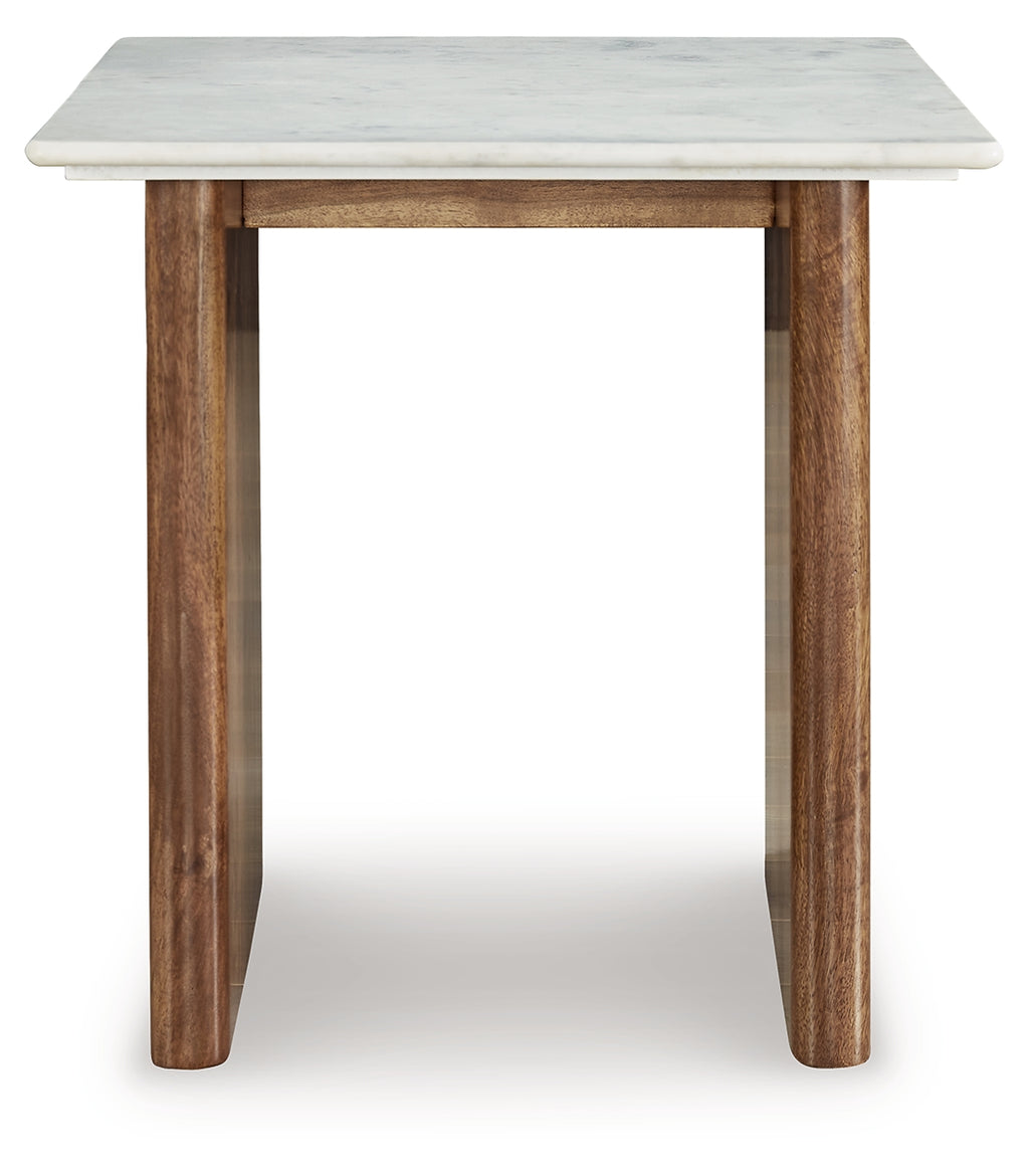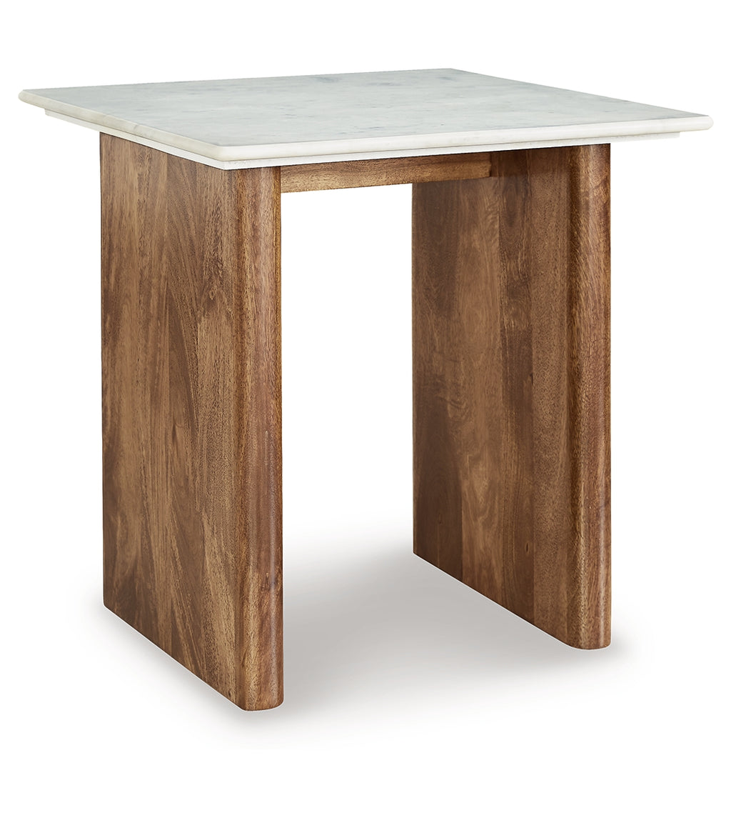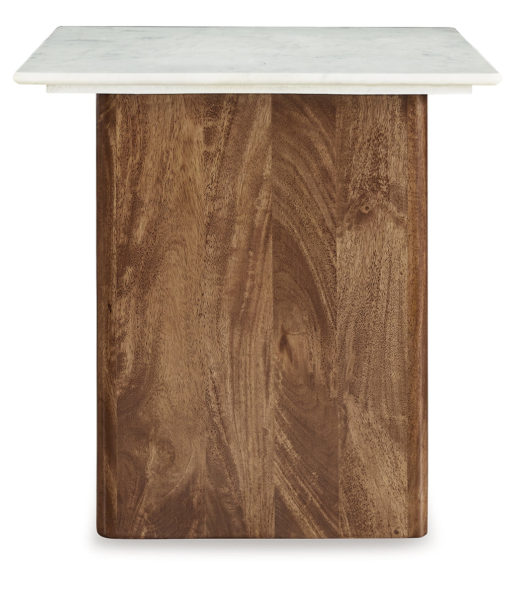 With its back-to-nature sensibility, this end table is a natural fit for outfitting your modern living area. Its clean-lined design lets the beautifully organic quality of the mango wood shine through, complemented by the sleek refinement of a marble top. This table is the ideal spot for decor, snacks and beverages. | Product Features