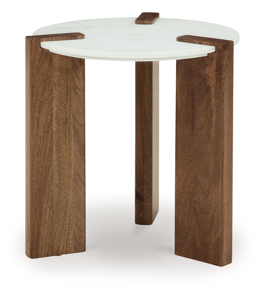 With its back-to-nature sensibility, this end table is a natural fit for outfitting your modern living area. Its clean-lined design lets the beautifully organic quality of the mango wood shine through, complemented by the sleek refinement of a marble top. This table is the ideal spot for decor, snacks and beverages. | Product Features