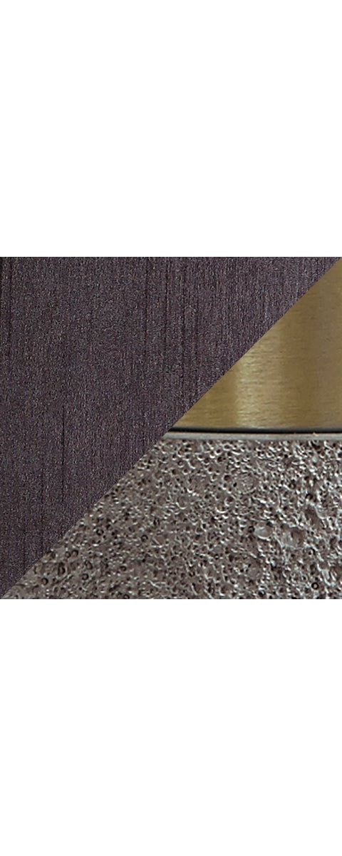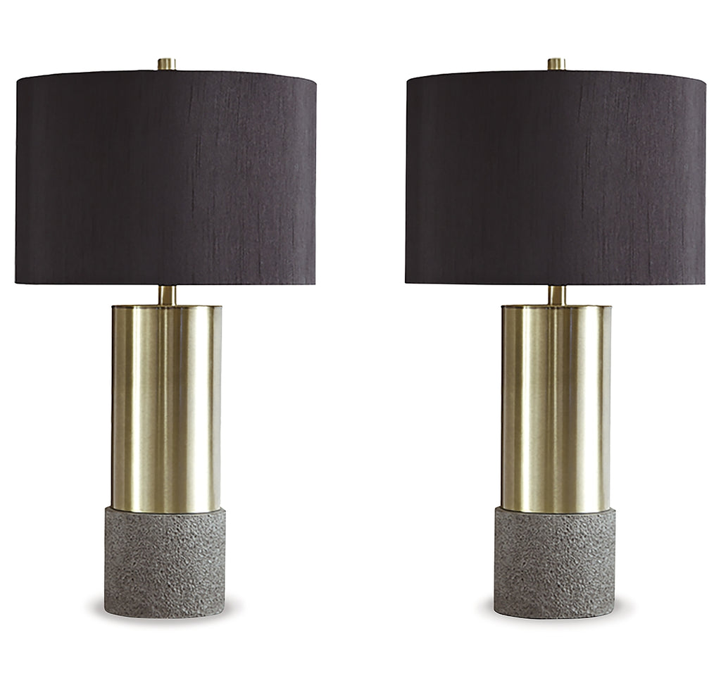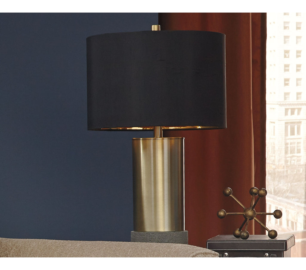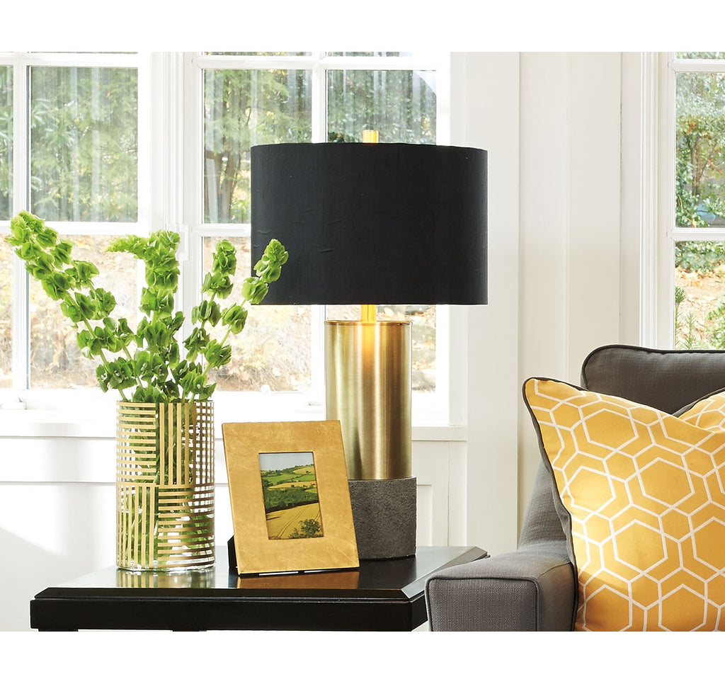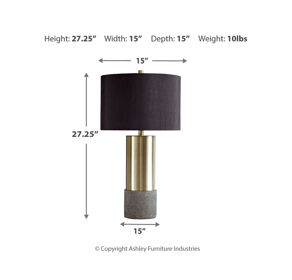 Faux concrete sets the stage for this ultra contemporary brass-tone table lamp. This substantial lamp is topped with a chic all-black shade with a goldtone foil interior for an elegant aesthetic. | Product Features