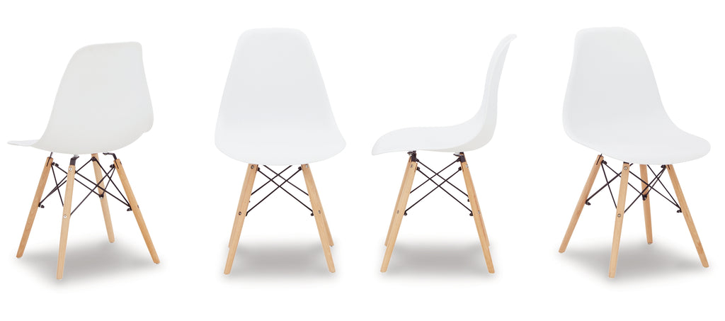 A contemporary take on a classic look, this dining room side chair adds a touch of artistic flair to your dining experience. The moulded white plastic seat with metal and beech wood base is intricately eye-catching. Its streamlined silhouette allows you and your guests to dine in style. | Product Features