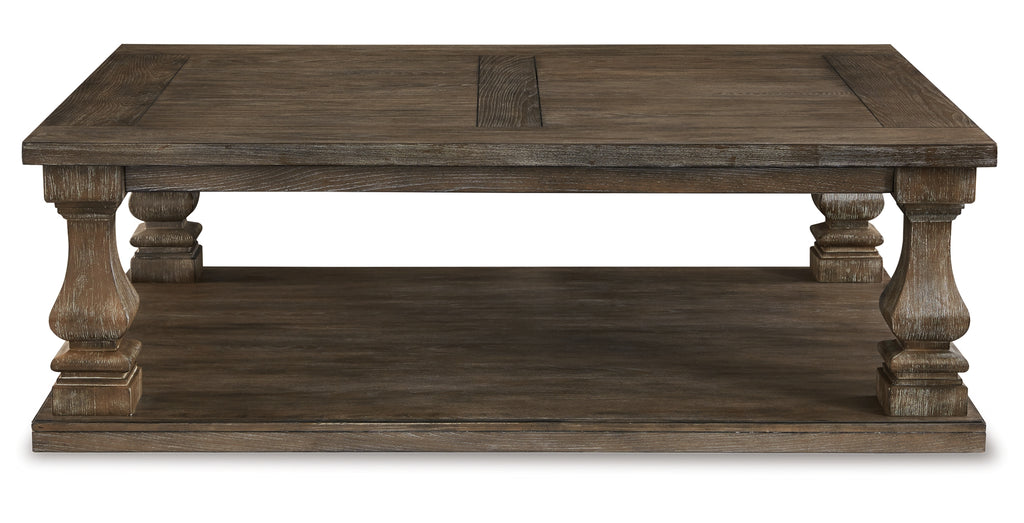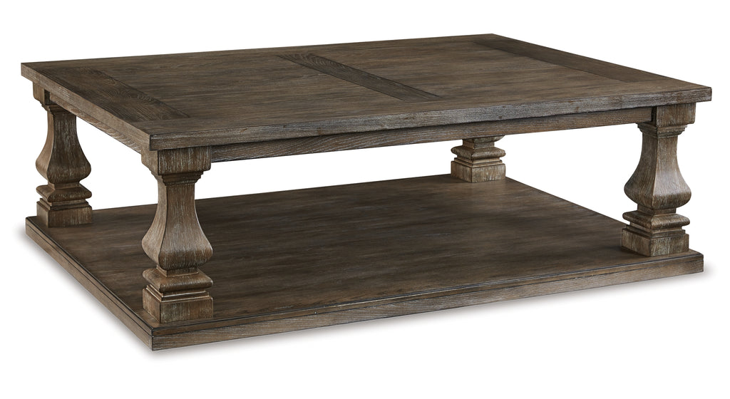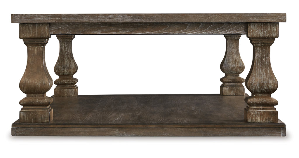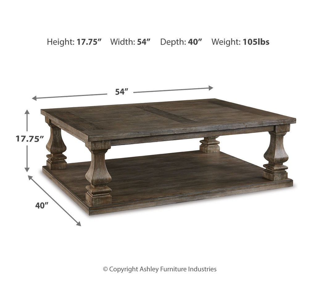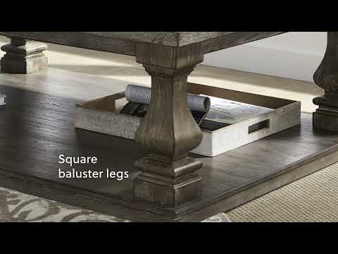 Homey. Hearty. Heavenly hued. Luring with a distressed weathered gray finish and square baluster legs set on a broad lower shelf for great presence, this coffee table is sure to make your homestead feel that much more like home. The look is beautified with elm veneers and a framed and plank-effect tabletop for a richly crafted masterpiece made for years of satisfaction. |
