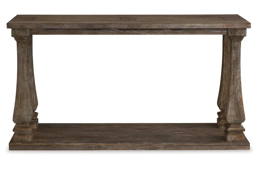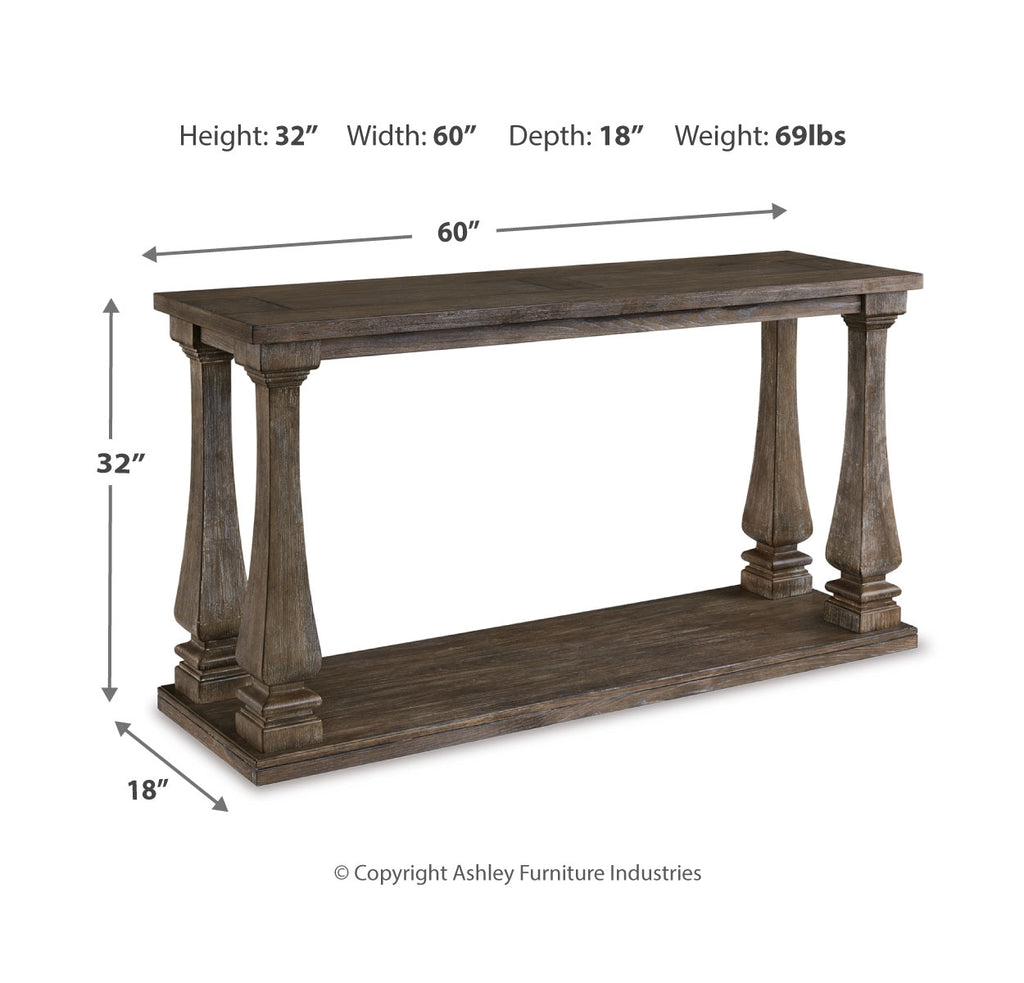 Homey. Hearty. Heavenly hued. Luring with a distressed weathered gray finish and square baluster legs set on a broad lower shelf for great presence, this sofa table is sure to make your homestead feel that much more like home. The look is beautified with elm veneers and a framed and plank-effect tabletop for a richly crafted masterpiece made for years of satisfaction. | Product Features