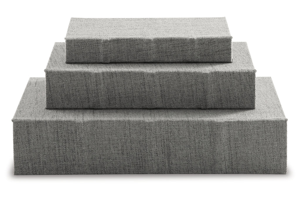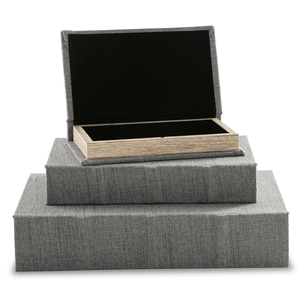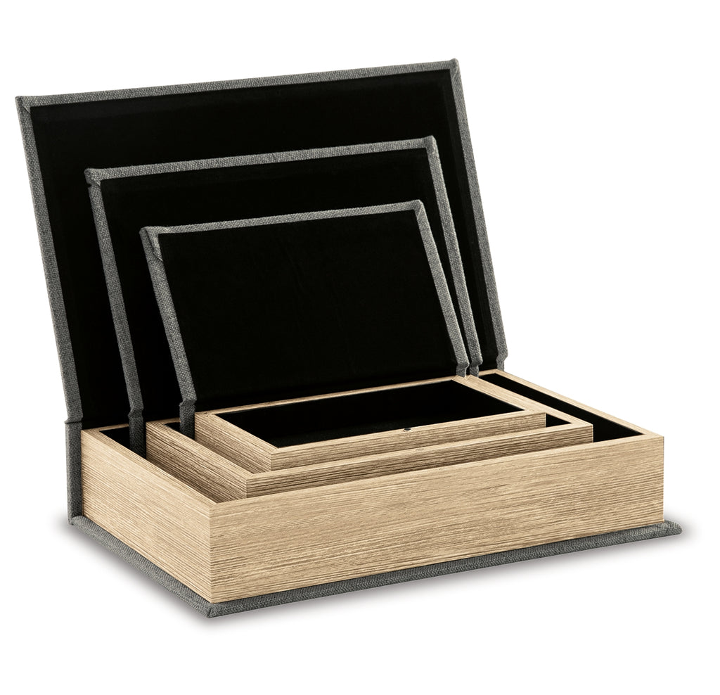 This set of three keepsake boxes makes storage so quietly understated. The gray cover is complemented inside with a black velvet lining. The perfect place for your dearest keepsakes, this set adds a touch of casual elegance to your decor. | Product Features