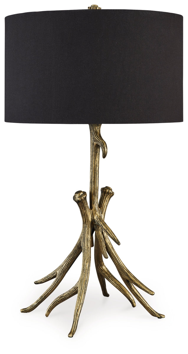 Illuminate your contemporary space with this table lamp. Finished in an antiqued goldtone, it makes a statement displayed solo, or as a pair flanking your sofa or sectional. A black shade keeps the look right on trend. | Product Features