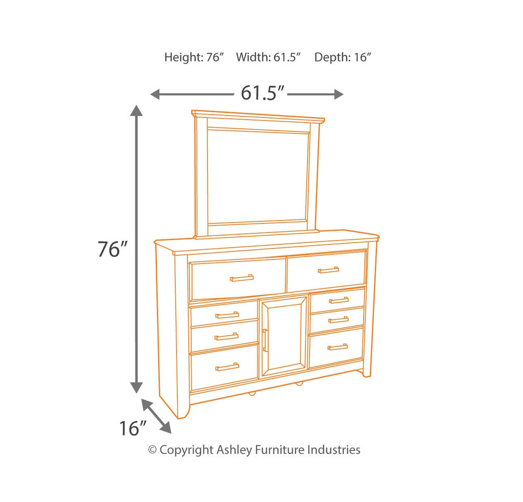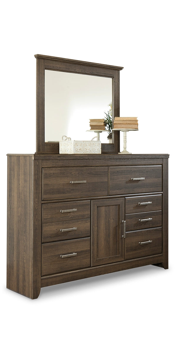 Get the look of posh barn wood without setting foot in a salvage yard. Replicated rough-sawn oak of this dresser and mirror set has a vintage finish that is reminiscent of a timeworn family heirloom. Warm, rustic and naturally beautiful, it’s just got that ageless appeal. Sleek, mod pulls in a pewter tone are a snappy finishing touch. | Product Features