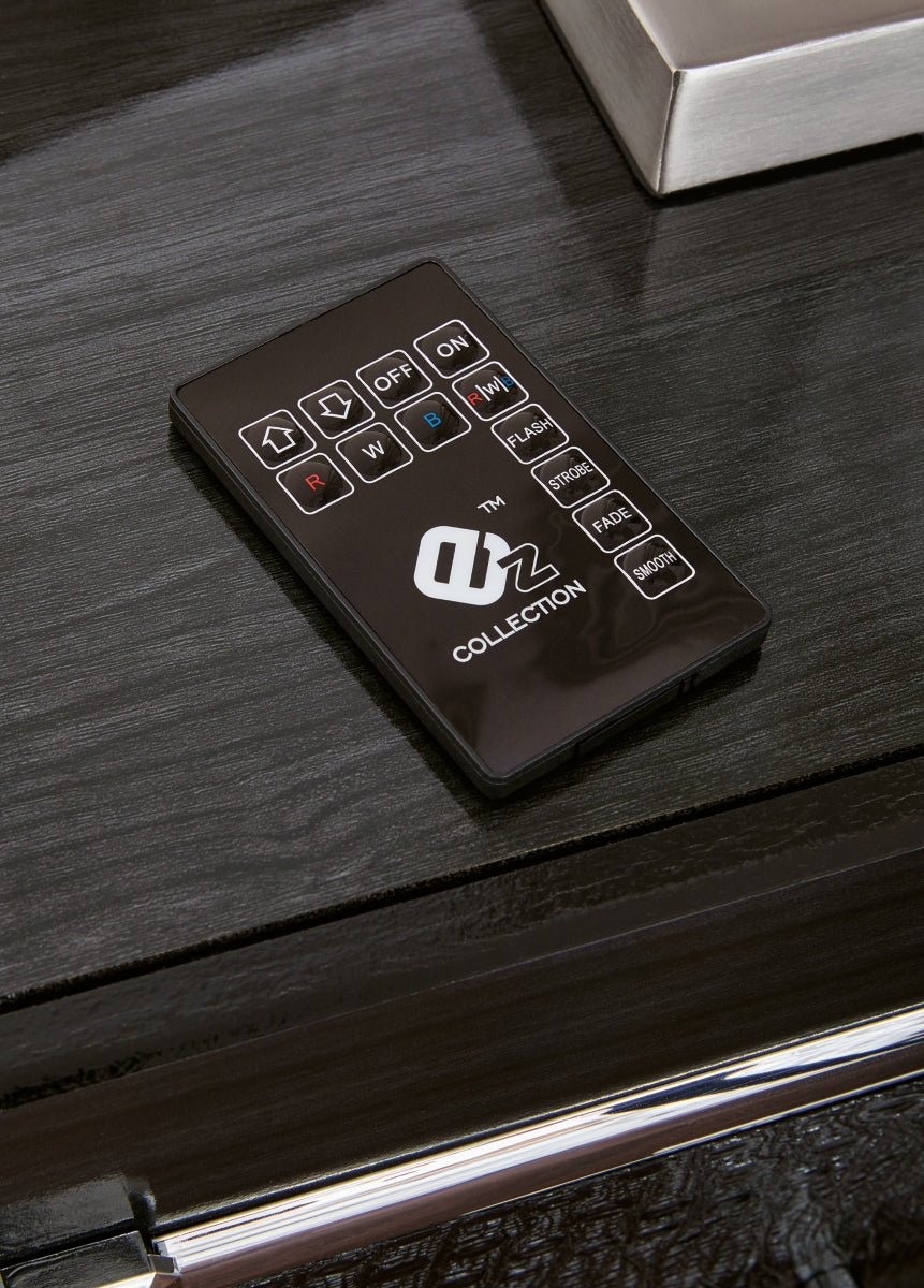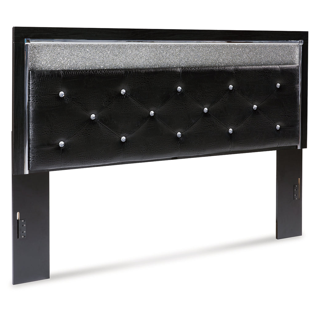 Rest easy. The luxurious look you’ve been dreaming of is yours for the taking, at a price sure to put you at ease. This king/California king upholstered headboard brings a sense of old Hollywood with a contemporary flair. A deep, dark finish, faceted chrome-tone accents and LED lighting exude Hollywood-chic style to the max. Padded windowpane stitching on the sleek black upholstery infuses a sumptuous look that’s upscale and indulgent, and utterly on trend. A wireless remote allows you to control the color and brightness to suit the mood. | Product Features