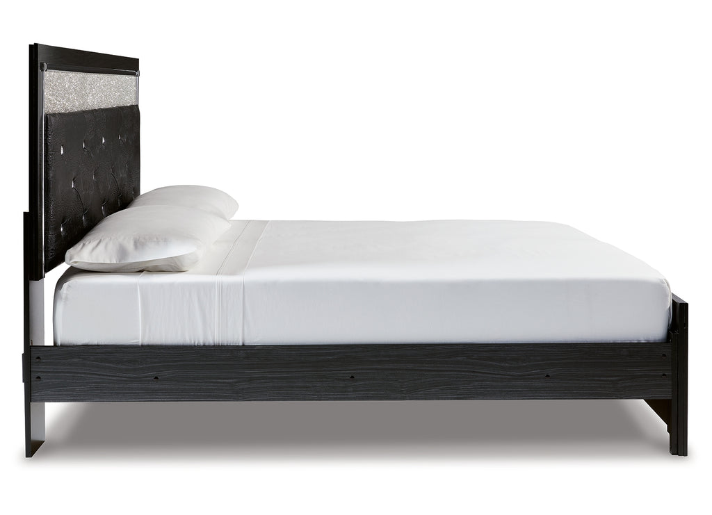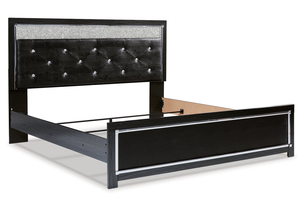 Rest easy. The luxurious look you’ve been dreaming of is yours for the taking, at a price sure to put you at ease. This king upholstered panel bed brings a sense of old Hollywood with a contemporary flair. A deep, dark finish, faceted chrome-tone accents and LED lighting exude Hollywood-chic style to the max. Padded windowpane stitching on the sleek, black upholstery infuses a sumptuous look that’s upscale and indulgent, and utterly on trend. A wireless remote allows you to control the color and brightness to suit the mood. | Product Features