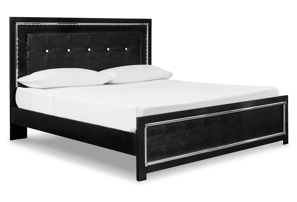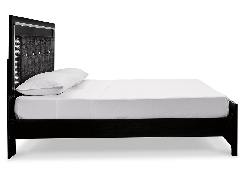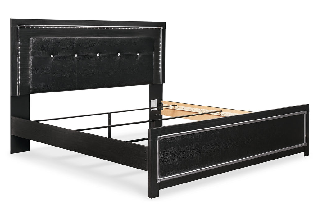 Rest easy. The luxurious look you’ve been dreaming of is yours for the taking—at a price sure to put you at ease. This panel bed brings a sense of old Hollywood with a contemporary flair. A deep, dark finish, faceted chrome-tone accents and LED lighting exude Hollywood-chic style to the max. Padded windowpane-stitching on the sleek, black upholstery infuses a sumptuous look that’s upscale and indulgent, and utterly on trend. A wireless remote allows you to control the color and brightness to suit the mood. | Product Features