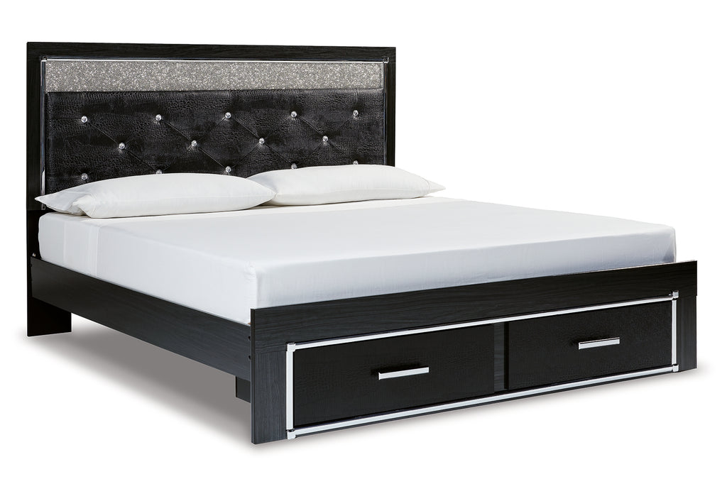 Rest easy. The luxurious look you’ve been dreaming of is yours for the taking, at a price sure to put you at ease. This king upholstered panel bed with storage brings a sense of old Hollywood with a contemporary flair. A deep, dark finish, faceted chrome-tone accents and LED lighting exude Hollywood-chic style to the max. Padded windowpane stitching on the sleek, black upholstery infuses a sumptuous look that’s upscale and indulgent, and utterly on trend. Double drawers at the foot of the bed provide space-saving storage. | Product Features