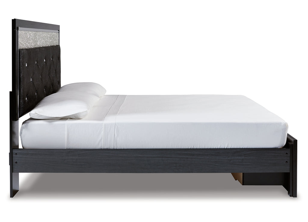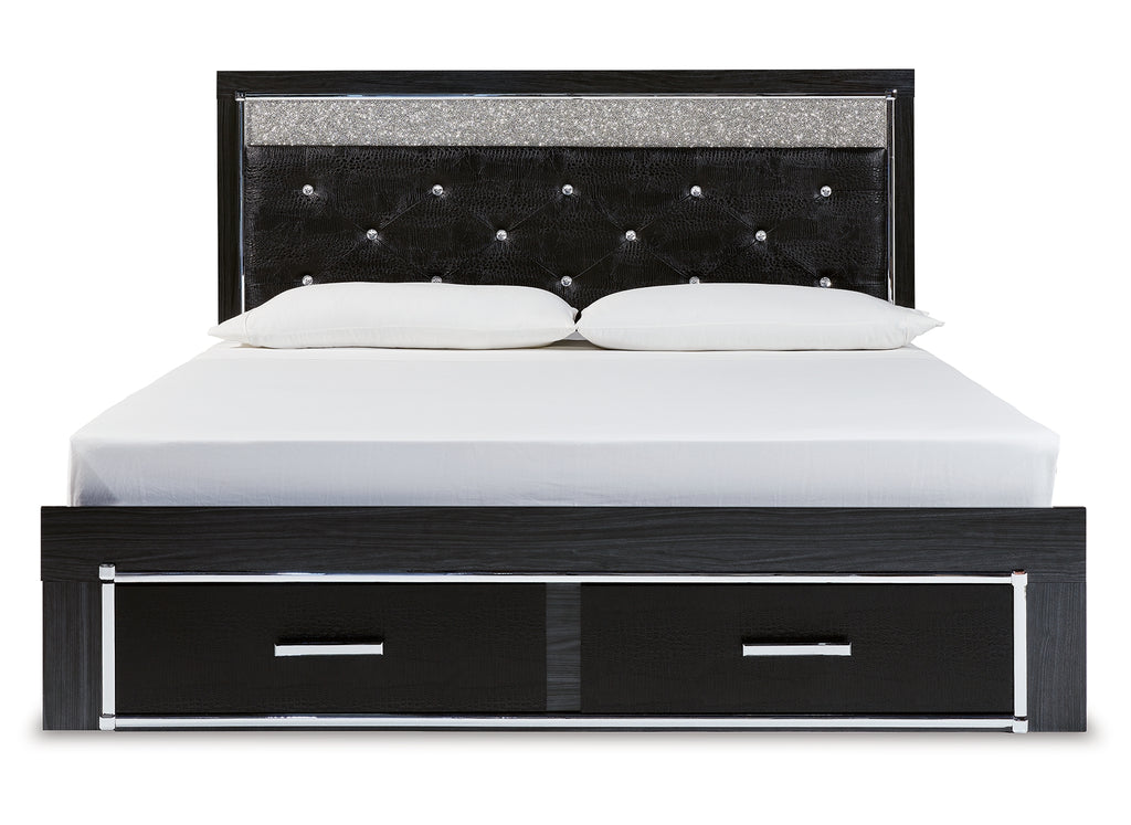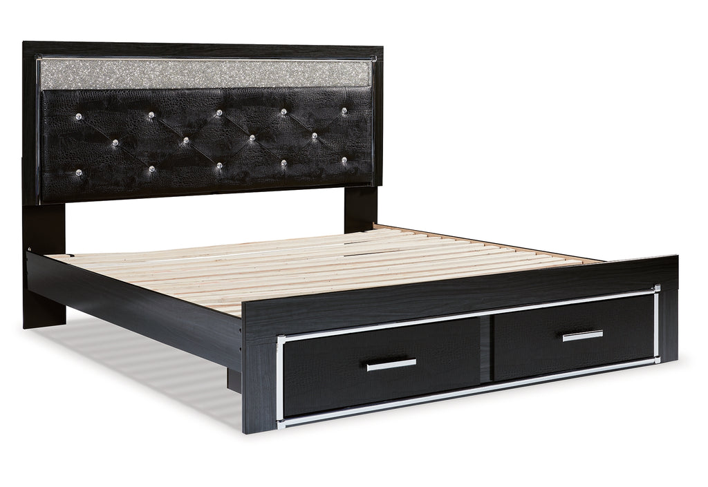 Rest easy. The luxurious look you’ve been dreaming of is yours for the taking, at a price sure to put you at ease. This king upholstered panel platform bed brings a sense of old Hollywood with a contemporary flair. A deep, dark finish, faceted chrome-tone accents and LED lighting exude Hollywood-chic style to the max. Padded windowpane stitching on the sleek, black upholstery infuses a sumptuous look that’s upscale and indulgent, and utterly on trend. Double drawers at the foot of the bed provide space-saving storage. | Product Features