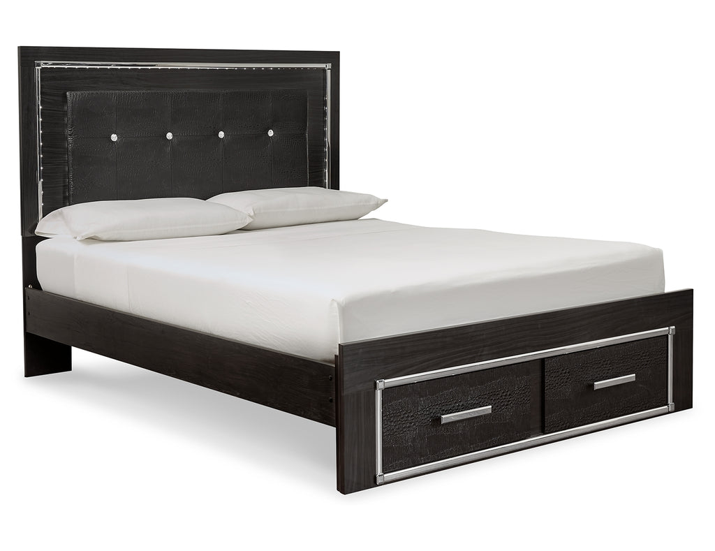 Rest easy. The luxurious look you’ve been dreaming of is yours for the taking—at a price sure to put you at ease. This storage bed brings a sense of old Hollywood with a contemporary flair. A deep, dark finish, faceted chrome-tone accents and LED lighting exude Hollywood-chic style to the max. Padded windowpane-stitching on the sleek, black upholstery infuses a sumptuous look that’s upscale and indulgent, and utterly on trend. A wireless remote allows you to control the color and brightness to suit the mood. | Product Features