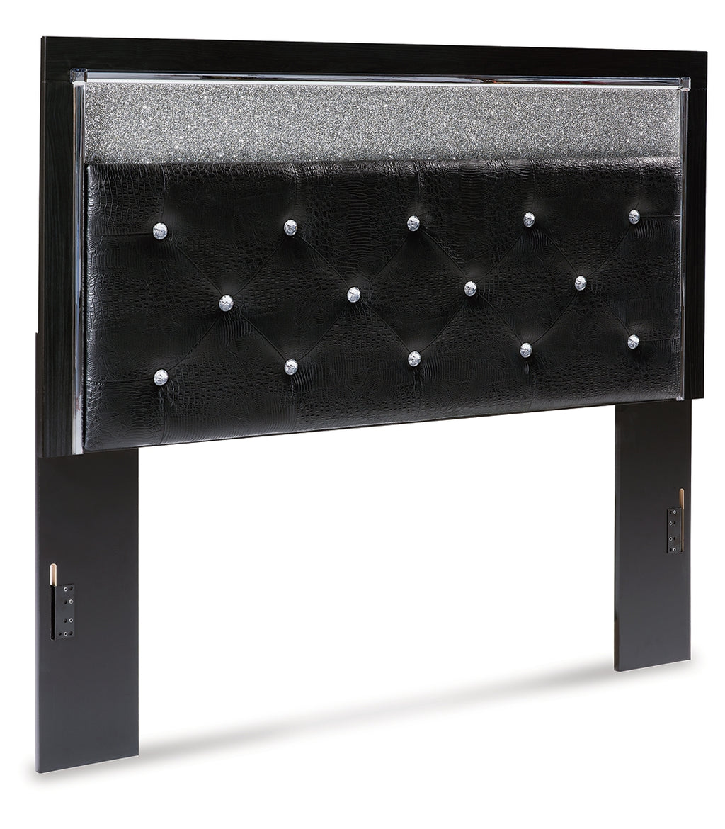 Rest easy. The luxurious look you’ve been dreaming of is yours for the taking, at a price sure to put you at ease. This queen upholstered headboard brings a sense of old Hollywood with a contemporary flair. A deep, dark finish, faceted chrome-tone accents and LED lighting exude Hollywood-chic style to the max. Padded windowpane stitching on the sleek black upholstery infuses a sumptuous look that’s upscale and indulgent, and utterly on trend. A wireless remote allows you to control the color and brightness to suit the mood. | Product Features